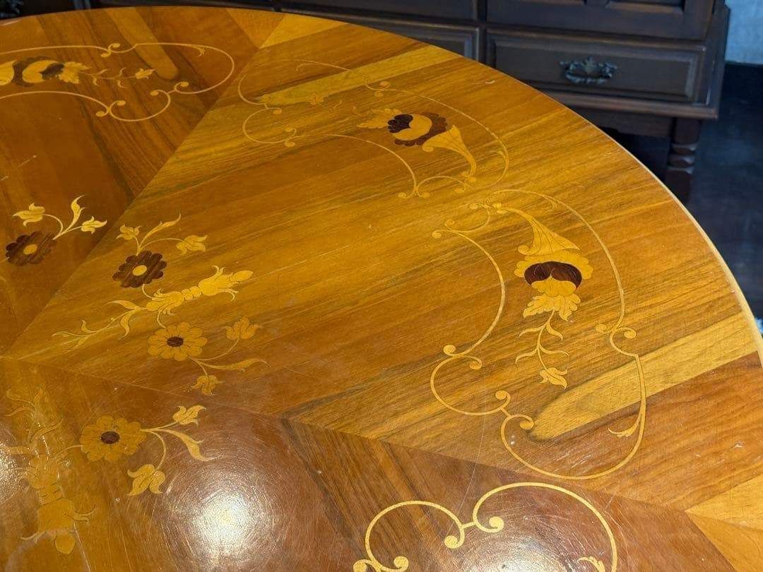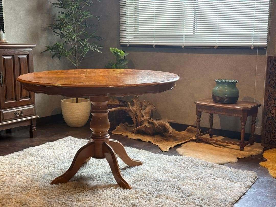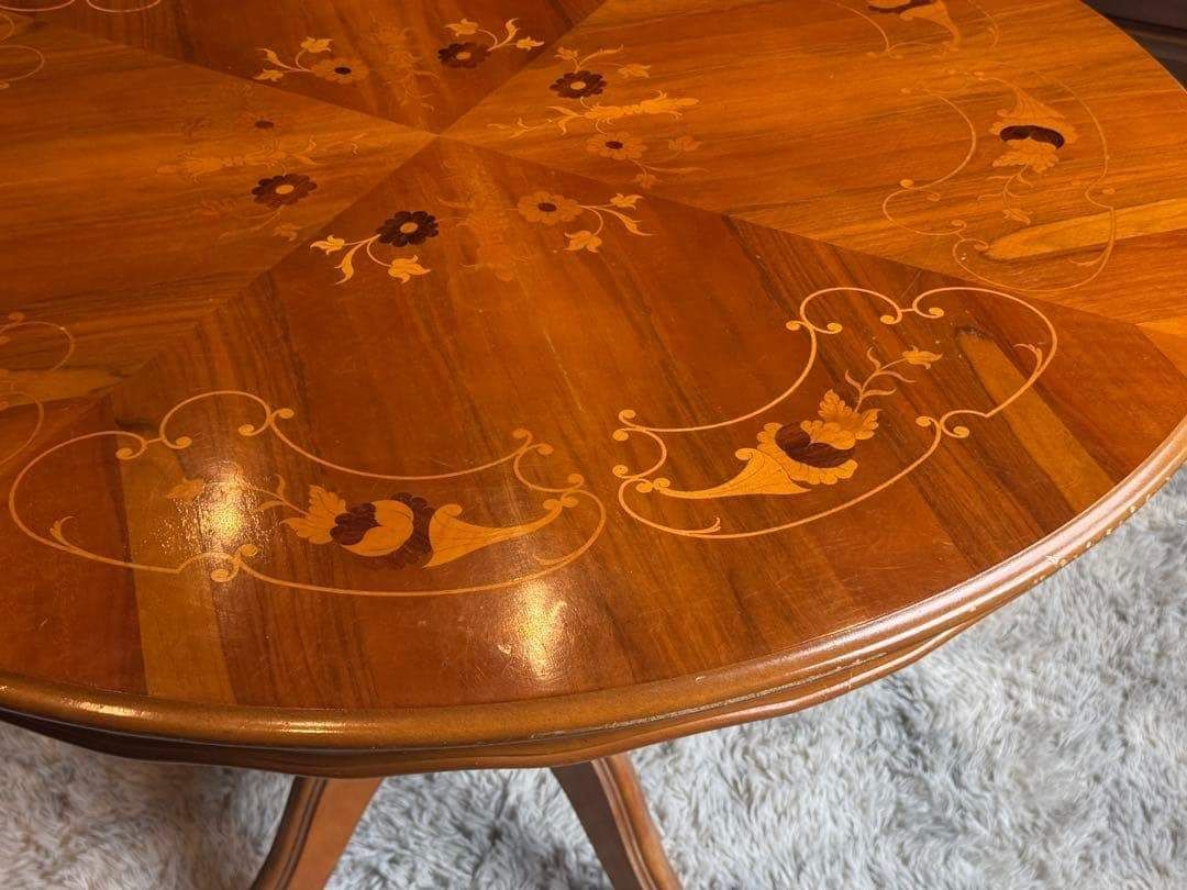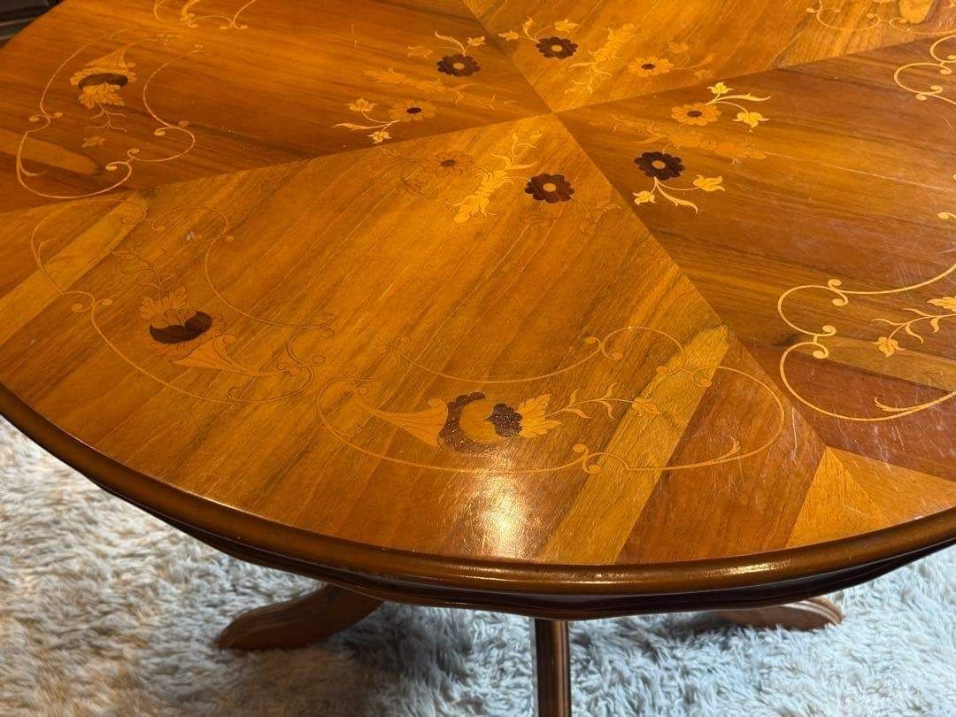 ラウンドテーブル 丸テーブル 象嵌 クラシック アンティーク ヴィンテージ レトロ 家具 クラシカル カフェテーブル 木製テーブル 一本脚 テーブルインテリア 店舗什器 丸テーブル ラウンドテーブル 艶感