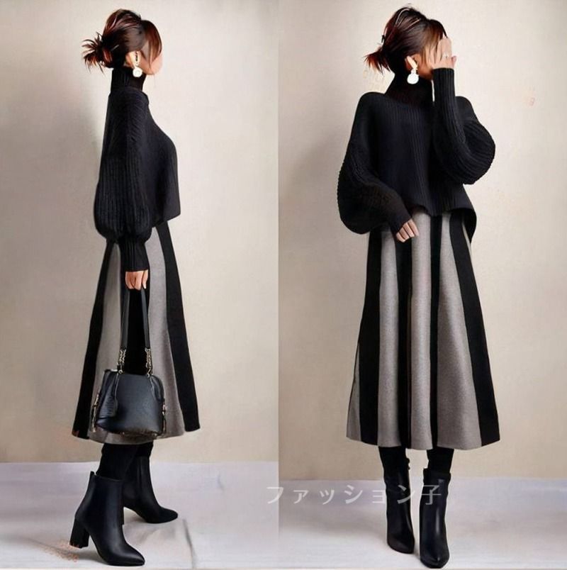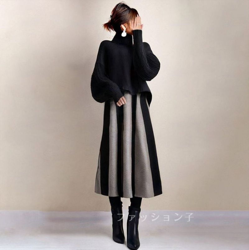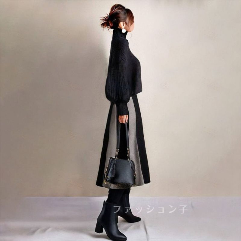 セットアップレディース秋冬 春秋 トップスレディースパフスリーブ 長袖プルオーバー ショート丈 ロングスカート バイカラー Aラインフレア 上下セット 2点SET weixz246