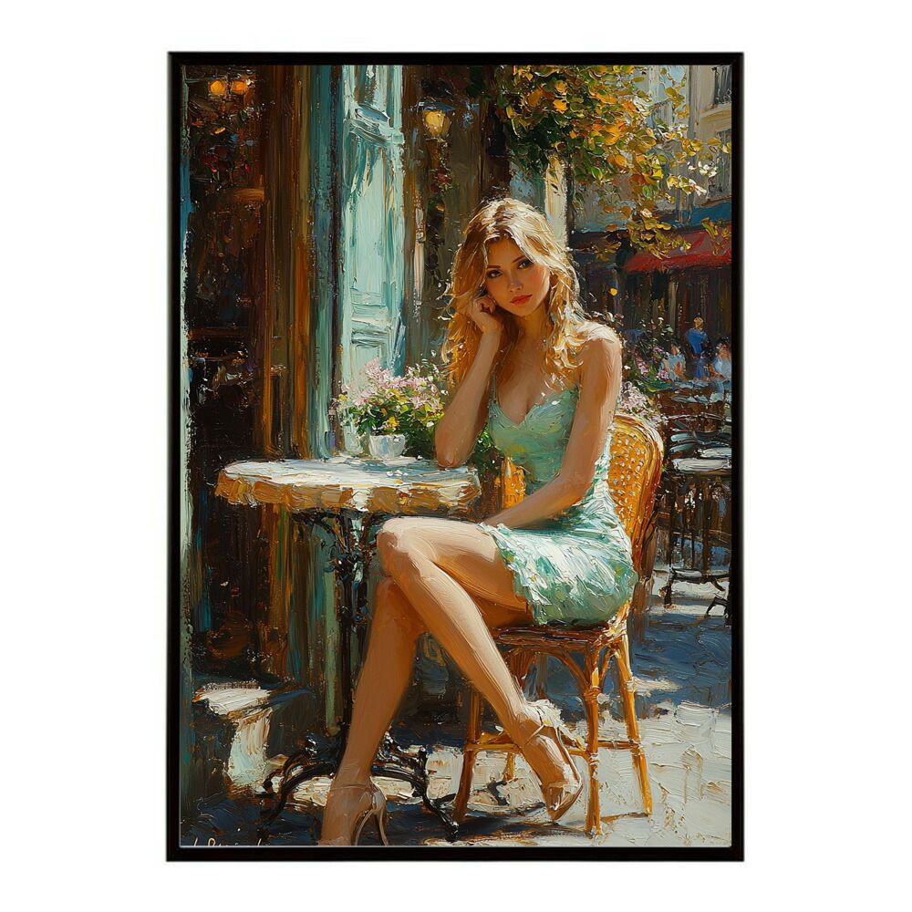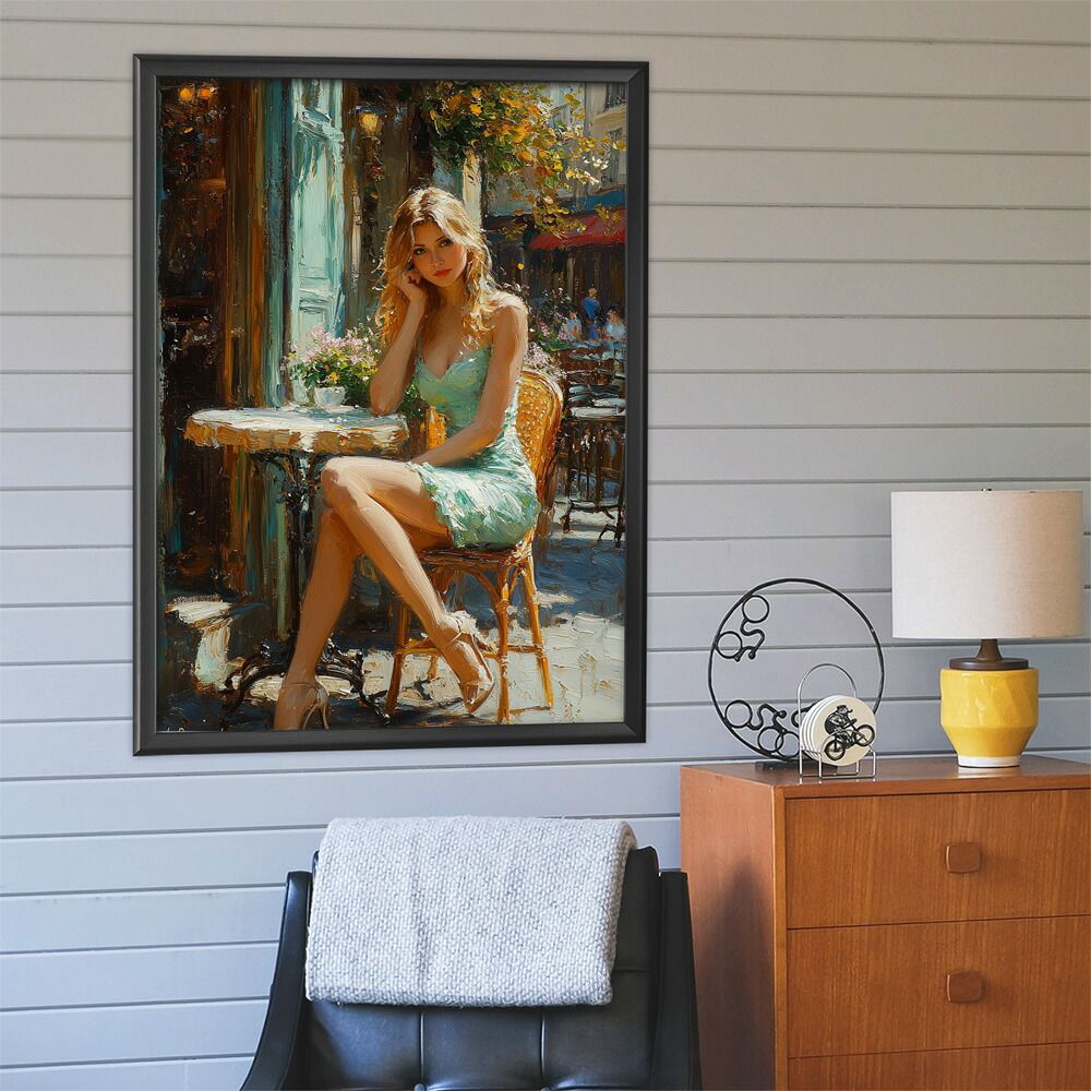 【A1サイズ(約59x84cm)】【lm-poster-2878】【フレーム付き】カフェに沈む午後 美女 絵画 画 油絵 ハンドメイド タッチ 手書き イラスト 街角 風景 カフェ ポスター イラスト