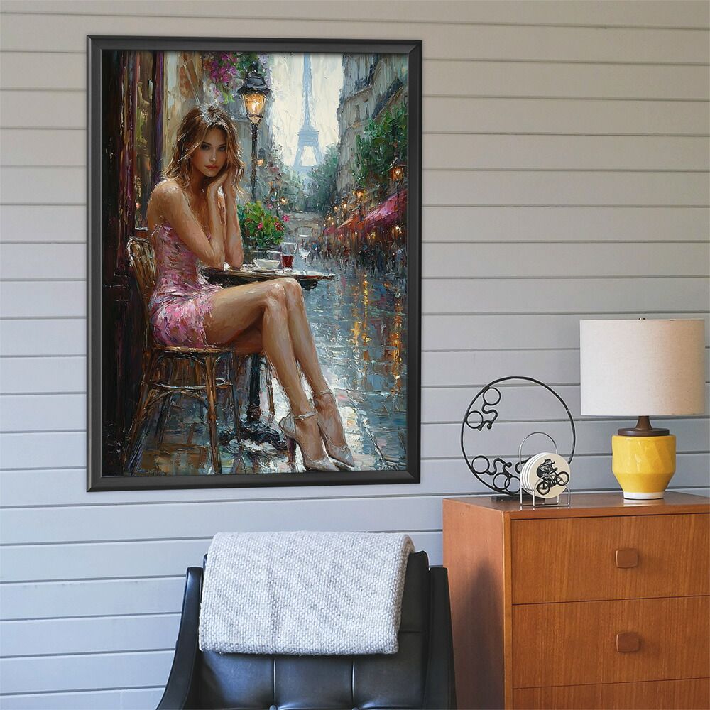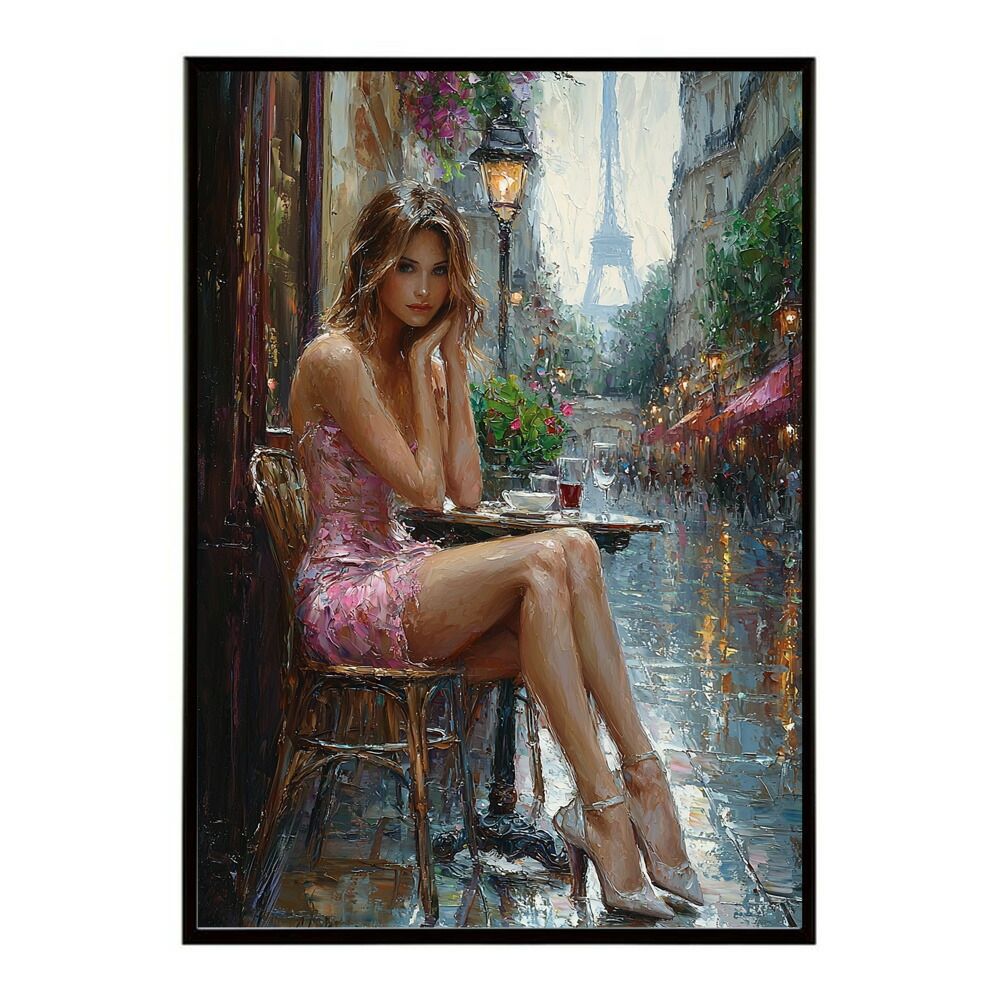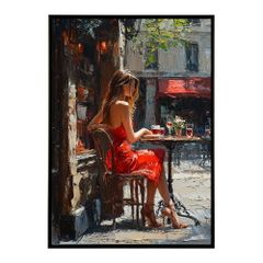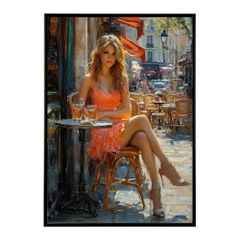 【A2サイズ(約42x59cm)】【lm-poster-2881】【フレーム付き】カフェに沈む午後 美女 絵画 画 油絵 ハンドメイド タッチ 手書き イラスト 街角 風景 カフェ ポスター イラスト
