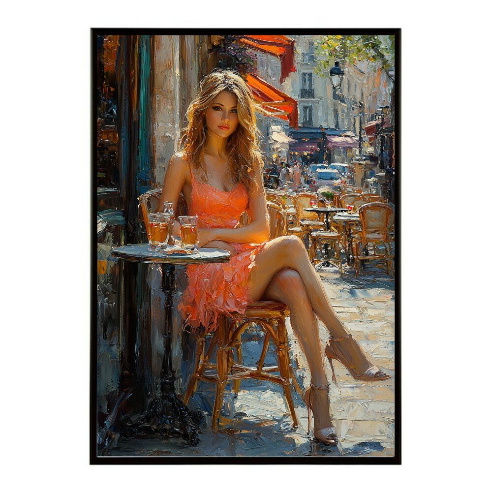 【A2サイズ(約42x59cm)】【lm-poster-2887】【フレーム付き】カフェに沈む午後 美女 絵画 画 油絵 ハンドメイド タッチ 手書き イラスト 街角 風景 カフェ ポスター イラスト