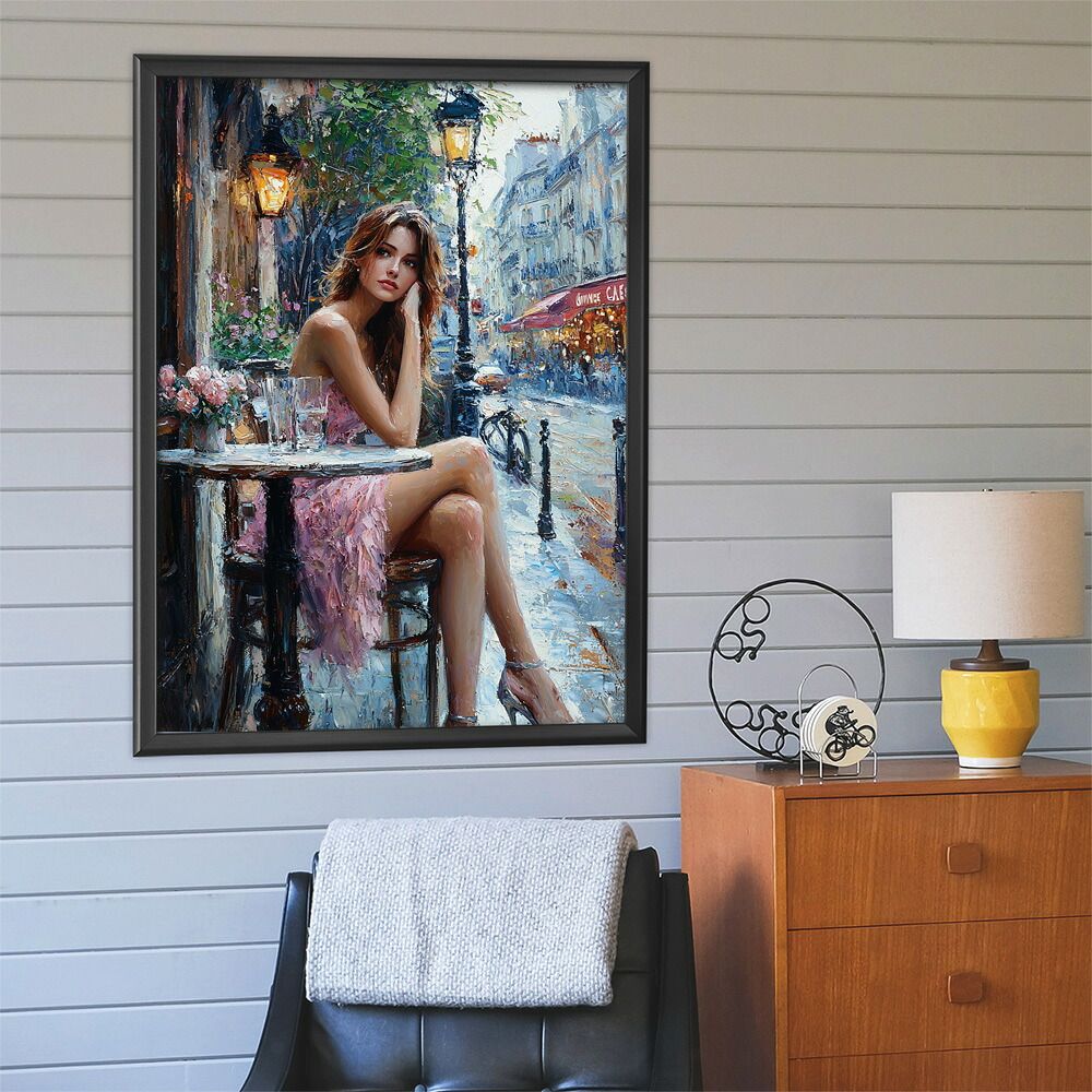 【B4サイズ(約25x36cm)】【lm-poster-2888】【フレーム付き】カフェに沈む午後 美女 絵画 画 油絵 ハンドメイド タッチ 手書き イラスト 街角 風景 カフェ ポスター イラスト