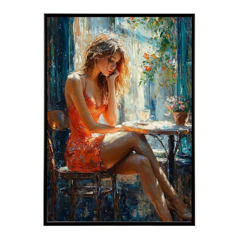 【A4サイズ(約21x30cm)】【lm-poster-2889】【フレーム付き】カフェに沈む午後 美女 絵画 画 油絵 ハンドメイド タッチ 手書き イラスト 街角 風景 カフェ ポスター イラスト