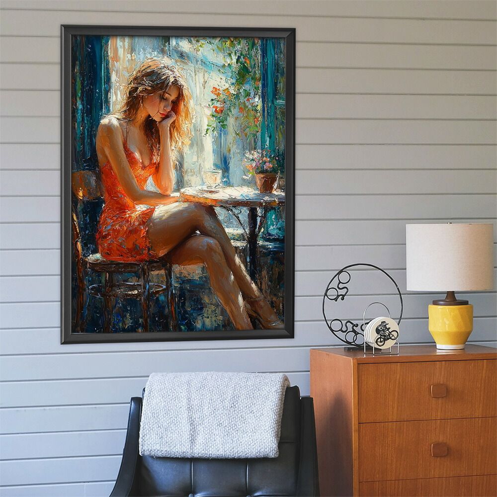 【B4サイズ(約25x36cm)】【lm-poster-2889】【フレーム付き】カフェに沈む午後 美女 絵画 画 油絵 ハンドメイド タッチ 手書き イラスト 街角 風景 カフェ ポスター イラスト