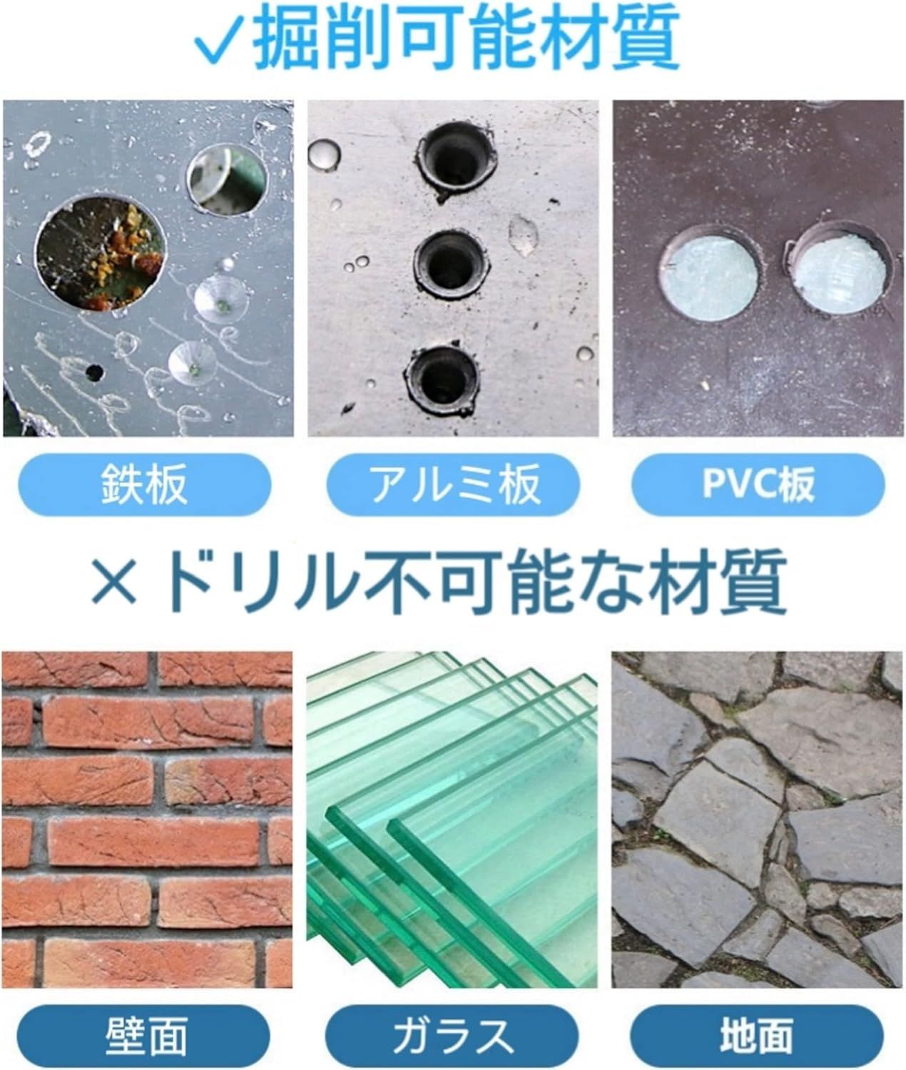 薄い鉄板、ステンレス、アルミ、木材、樹脂等の穴あけから穴拡大、面取り、バリ取り作業などにお使い下さい。