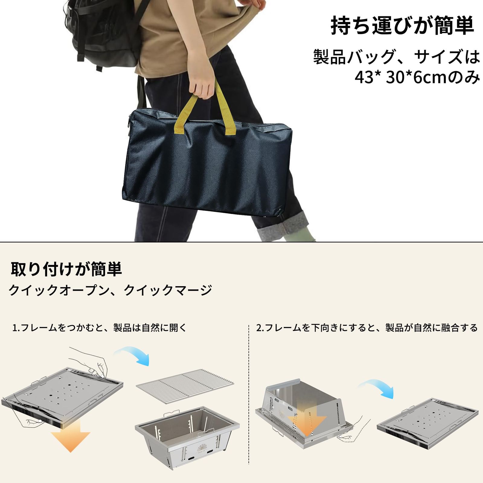 SUN-YE 折り畳みコンロ バーベキュー コンロ BBQグリル 焚き火台 igtテーブル用 調整可能な炉内燃焼カーボンプレートの高さ ステンレス製 瞬時に展開・収納 ステンレス鋼 1枚 ステンレス棒 2本 IH調理器対応 収納袋付き