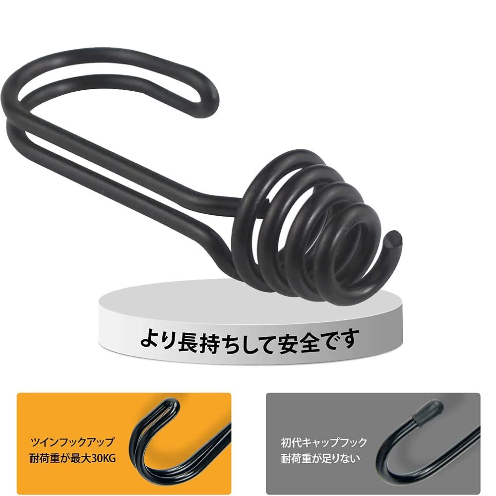 【安全&丈夫】従来品の2倍の強度でガッチリと固定します。鋭い先端がなく安全性を確保します。ツインフックを採用して、切り口がなく、丸く太く加工されております。表面に錆防止の加工がされ、雨天でも安心使用でき、老化を有効に防ぎ、市販されているストレッチコードよりは耐用性が150%向上しました。