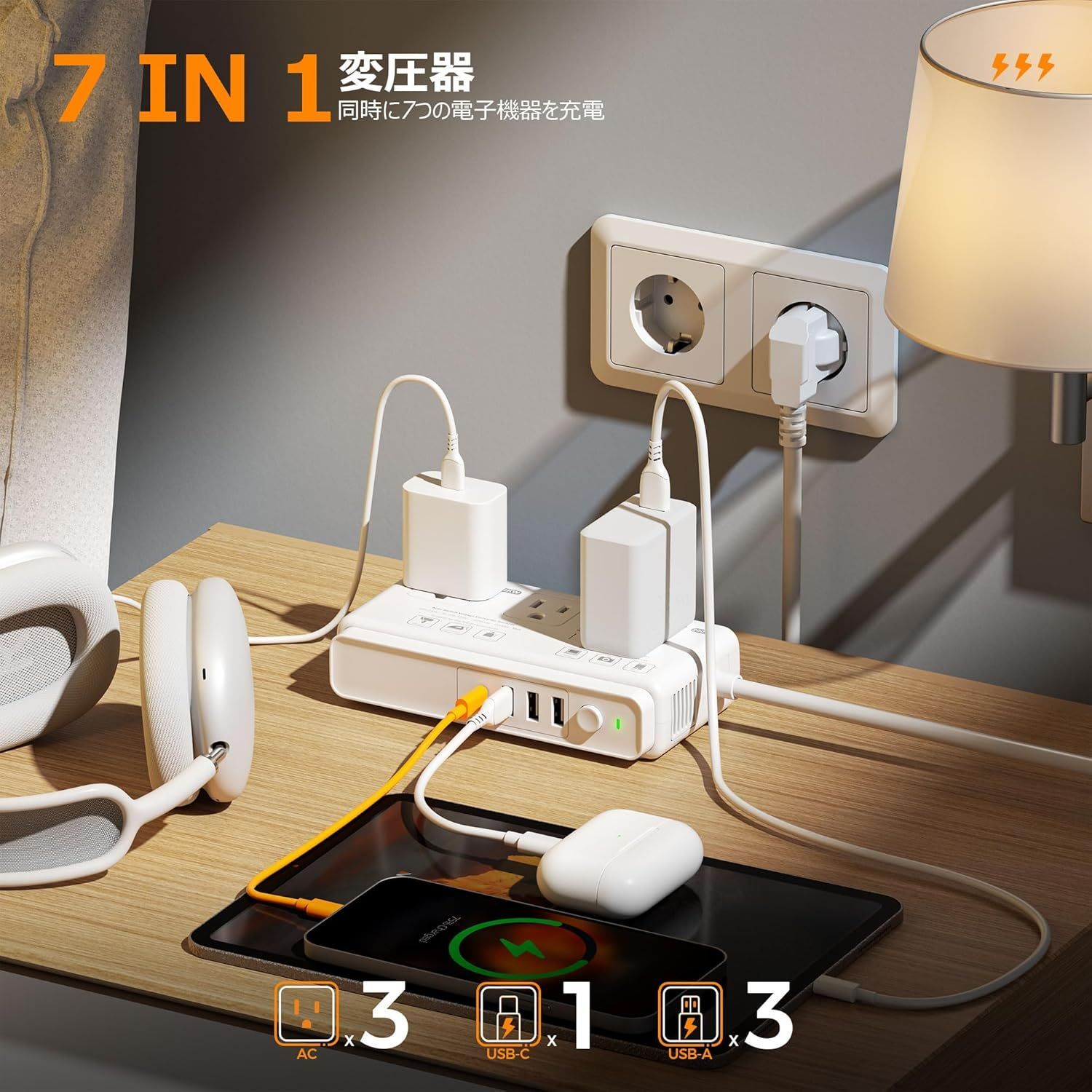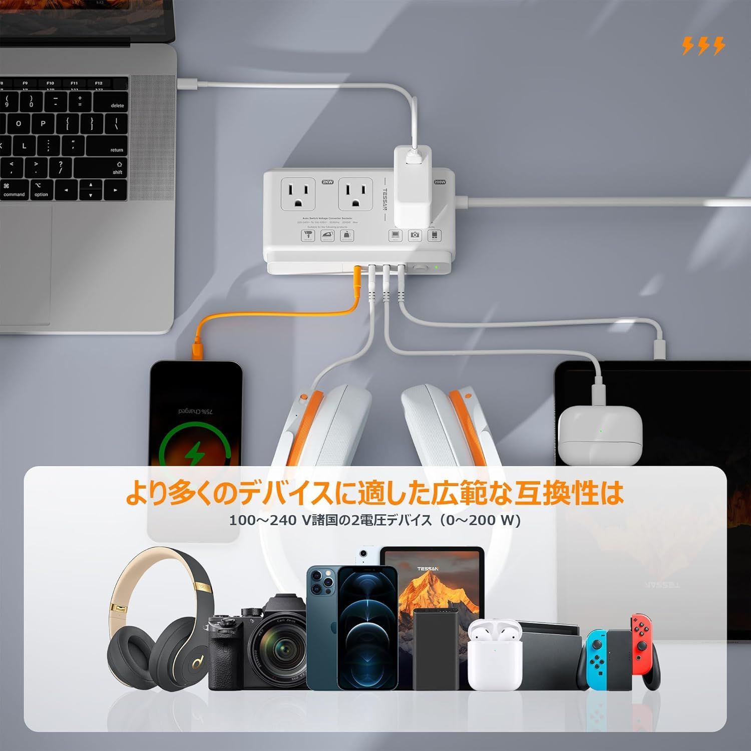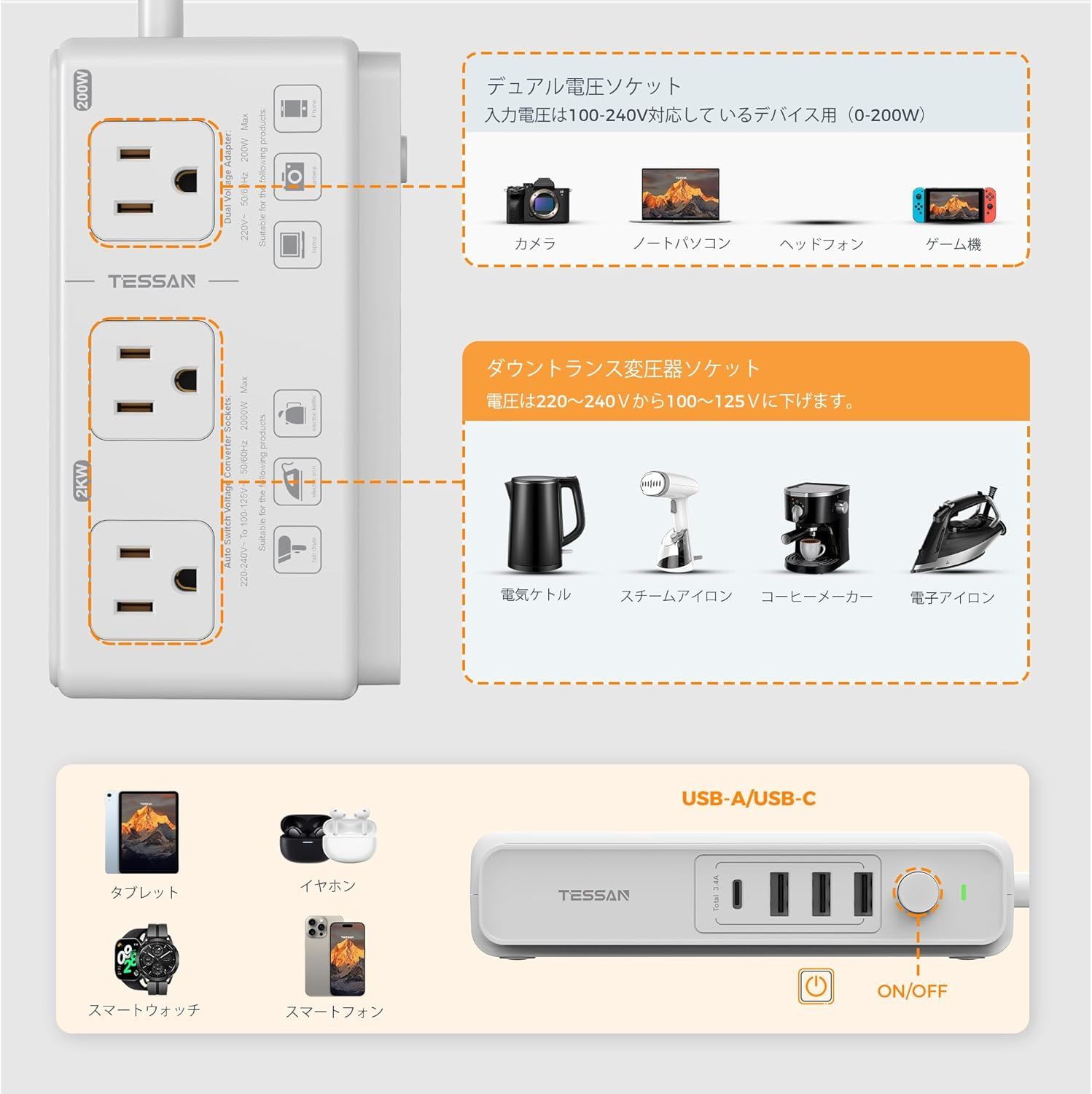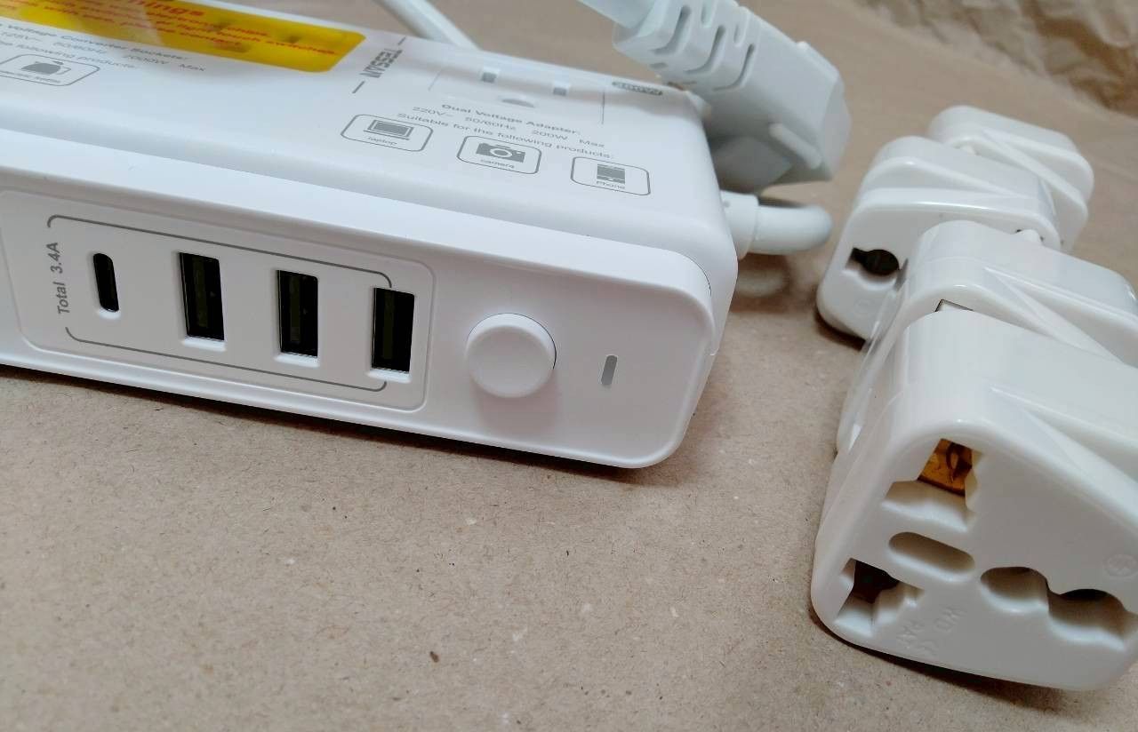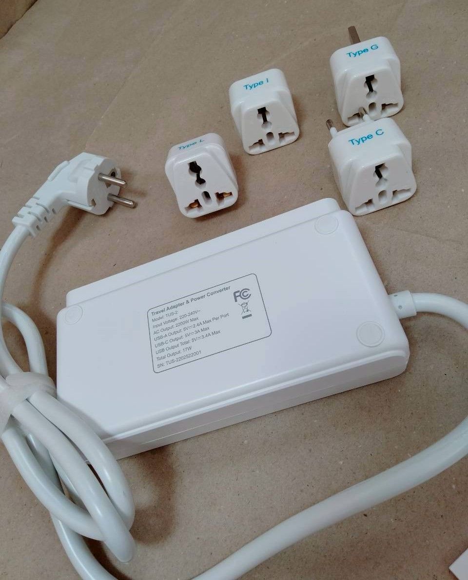 最大2000Wのピーク電力を変換が可能で220V~240V(50/60Hz)の電圧を100-110V(50/60Hz)に変換し最大出力は200Wで日本仕様の電化製品を海外でも簡単に使用できます。全ポート合計最大3.4A/17Wの充電が可能です。一度に複数のデバイスを同時に充電出来ます。