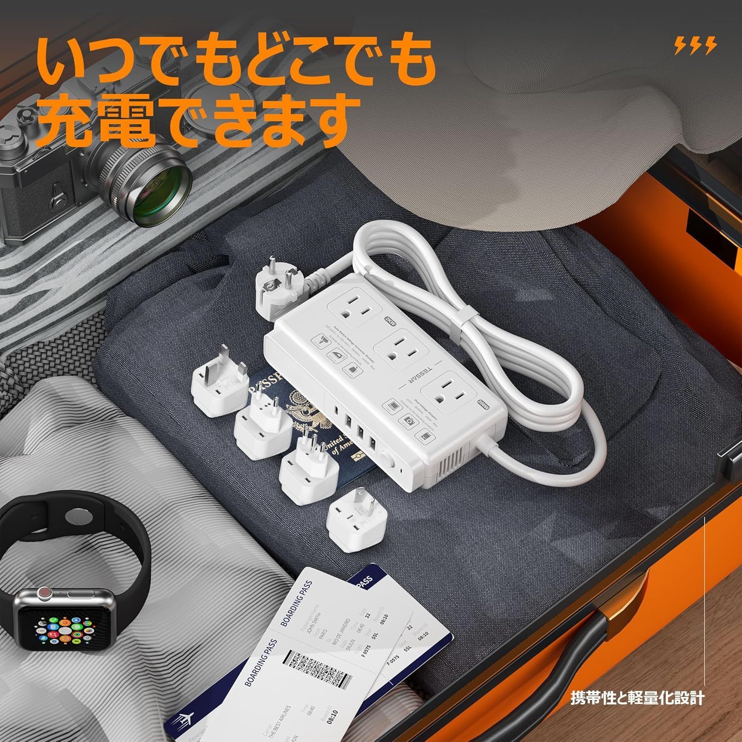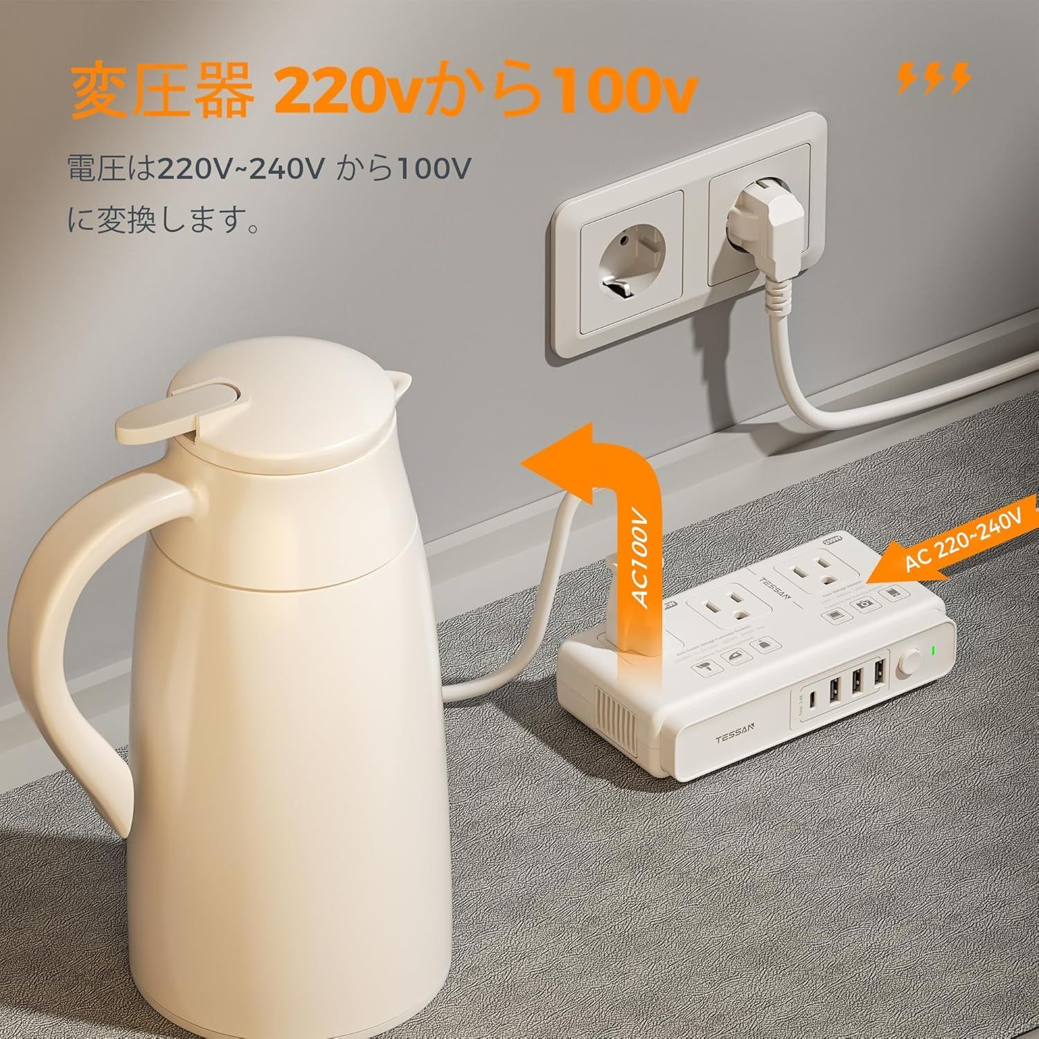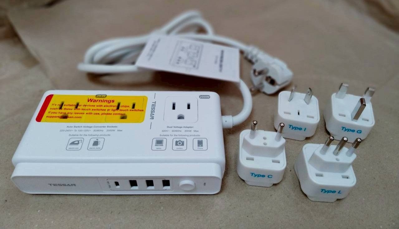 変圧器 海外旅行用 韓国 220vから100v TESSAN SEタイプ プラグ延長コード付き 海外 コンセント 変換プラグ C BF O Lタイプ付き 全世界対応 海外変圧 3USB-A 1USB-C 降圧トランス 電圧変換器 タイ ヨーロッパ シンガポール オーストラリア ドイツ イタリアなど適用