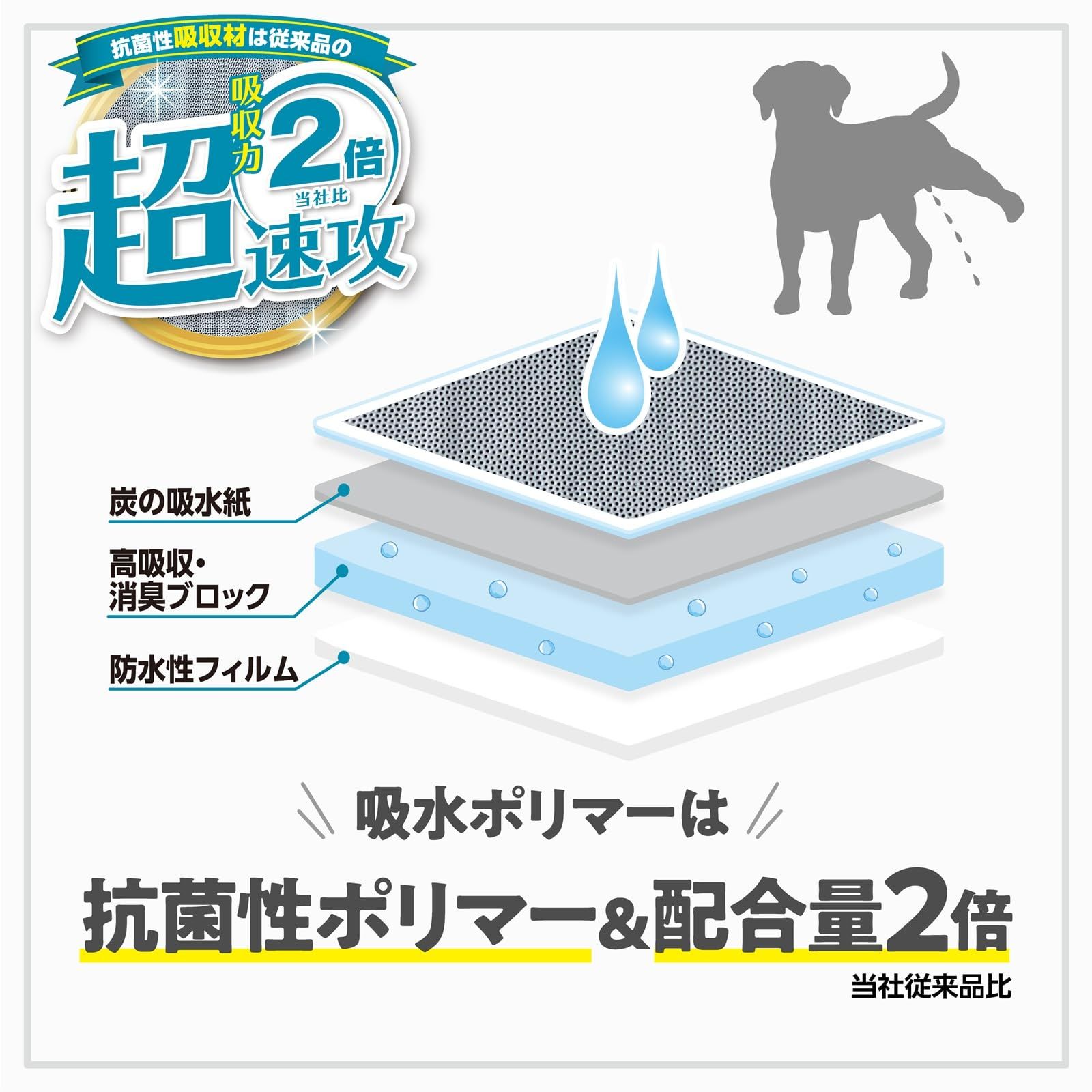 ・超長時間消臭を実現したペットシーツ。逆戻りも抑えた快適設計 ・表面は超吸収メッシュシートが一瞬にしてオシッコを吸収帯へ!足濡れで床が汚れるお悩みも解消 ・W消臭neoシリーズの消臭機能「消臭剤ケスモン、抗菌材Ag+、抗菌性ポリマー」を配合し、オシッコの悪臭に効果が大きい消臭材「パンシル」を追加配合。長時間消臭を実現しました。 ・表面のメッシュの下には炭を含んだ吸水紙を使用しているので汚れが目立ち難く消臭効果も期待出来ます。 ・抗菌性ポリマーはメーカーレギュラー品の約2倍の配合量だから長時間の成犬の尿も余裕で吸収します。