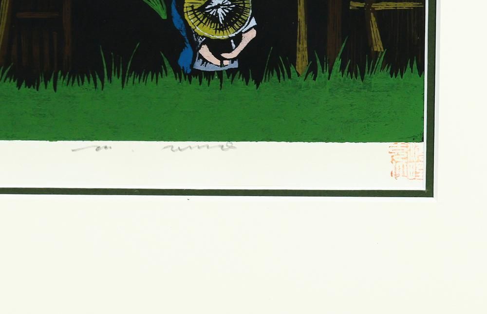1939-1979 静岡県静岡市に生まれる、中学1年より本格的に版画を制作、1977年にはスイス美術賞展優秀賞を受賞するなど、版画家として第一線で活躍をしながら39歳の若さで急逝した版画家、作風は、それぞれの風土の中でひたむきに生きる人間が描かれている作品が多く、木版の黒版の上に色を重ねた技法(陰刻)が特徴、氏のやさしい人間観が表現されており、見る者の心に不思議な懐かしさを感じさせる