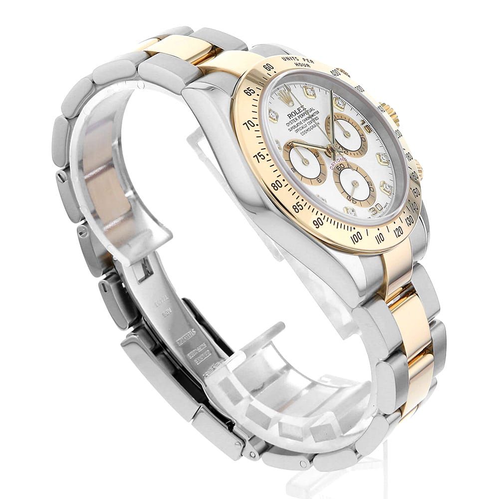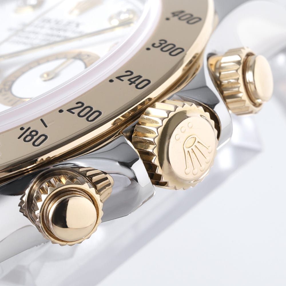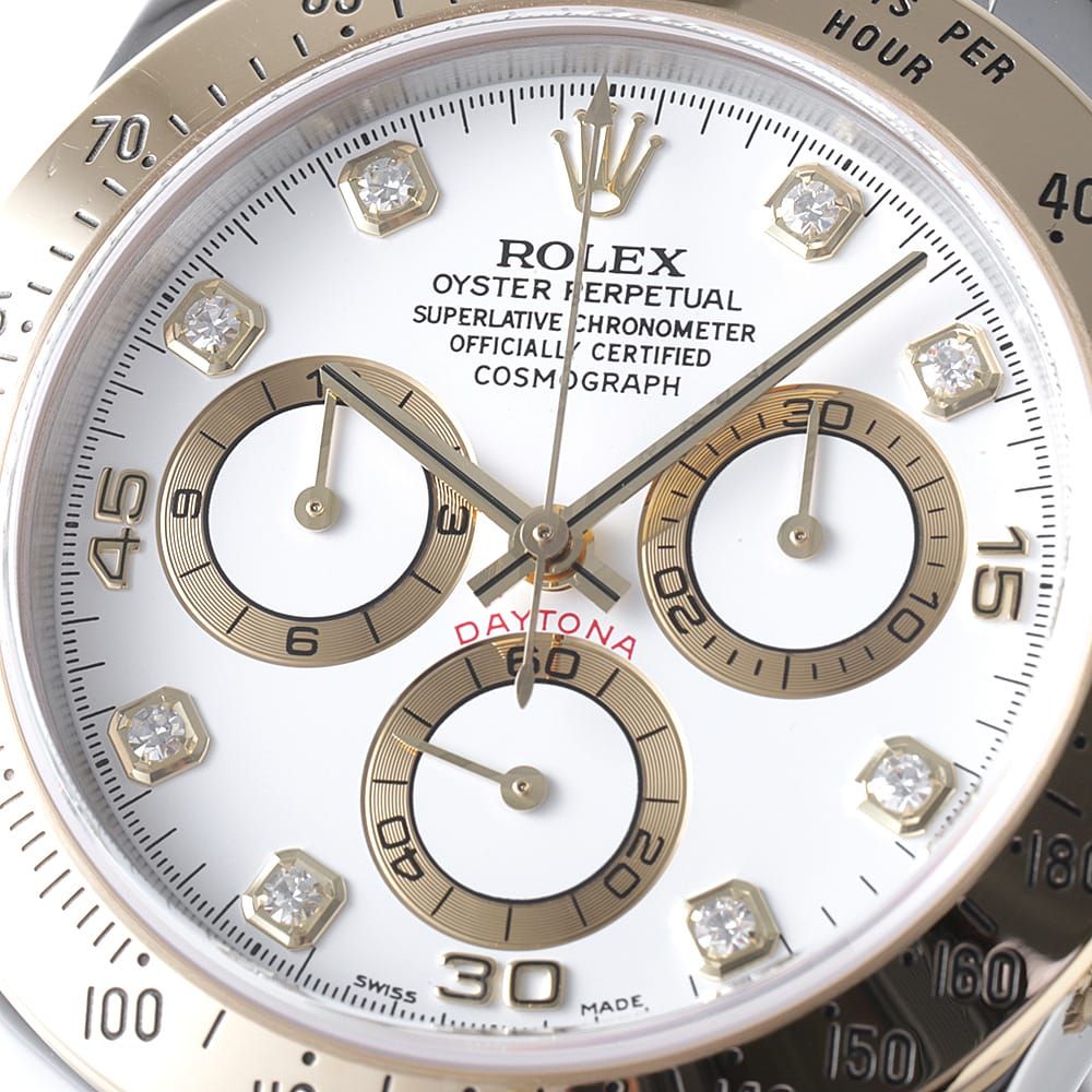 ■モデル情報:ベゼルに直接タキメーターを刻み、レーシングイメージが強いモデルとして発表された\"コスモグラフ デイトナ\"。スポーティで高級感あふれるデザインは、ロレックスの数多いモデルの中で一番人気と言っても過言ではありません。こちらは、インデックスに8個のダイヤモンドがセッティングされ、とても華やかなモデルとなっています。