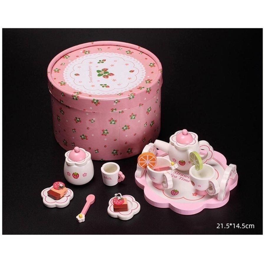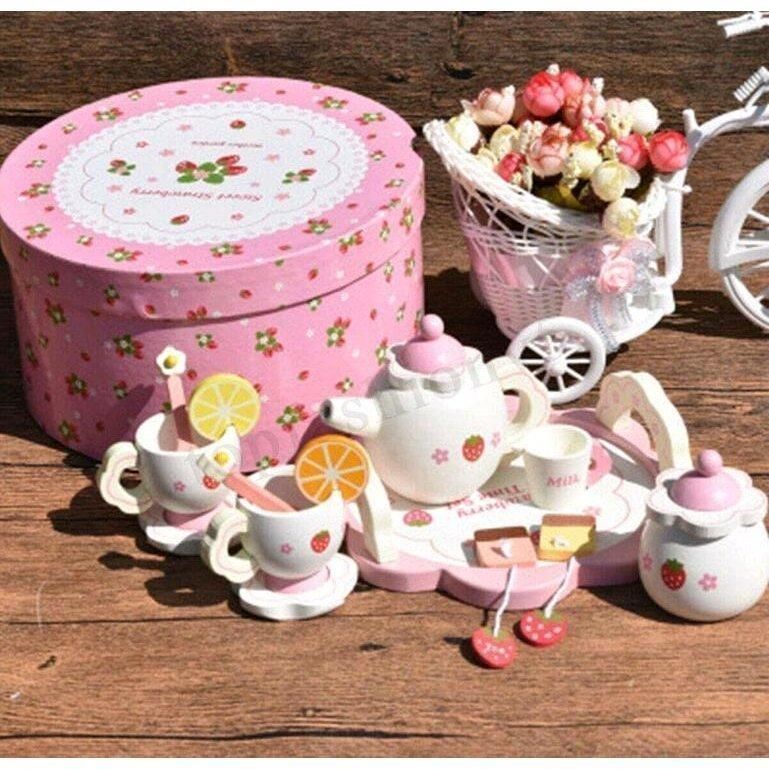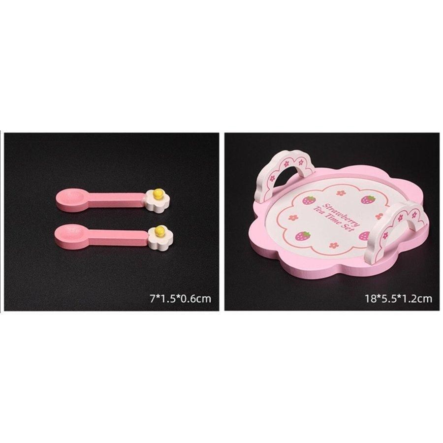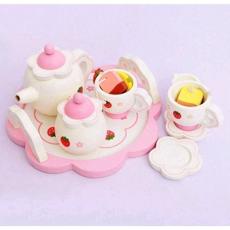 木製ティーセットには、ティーポット1個、シュガーポット1個、カップ2個、トレイ1個、皿2個、スプーン2個、ミルクカップ1個、フルーツ2個、ティーバッグ2個、収納ボックス1個が含まれます。