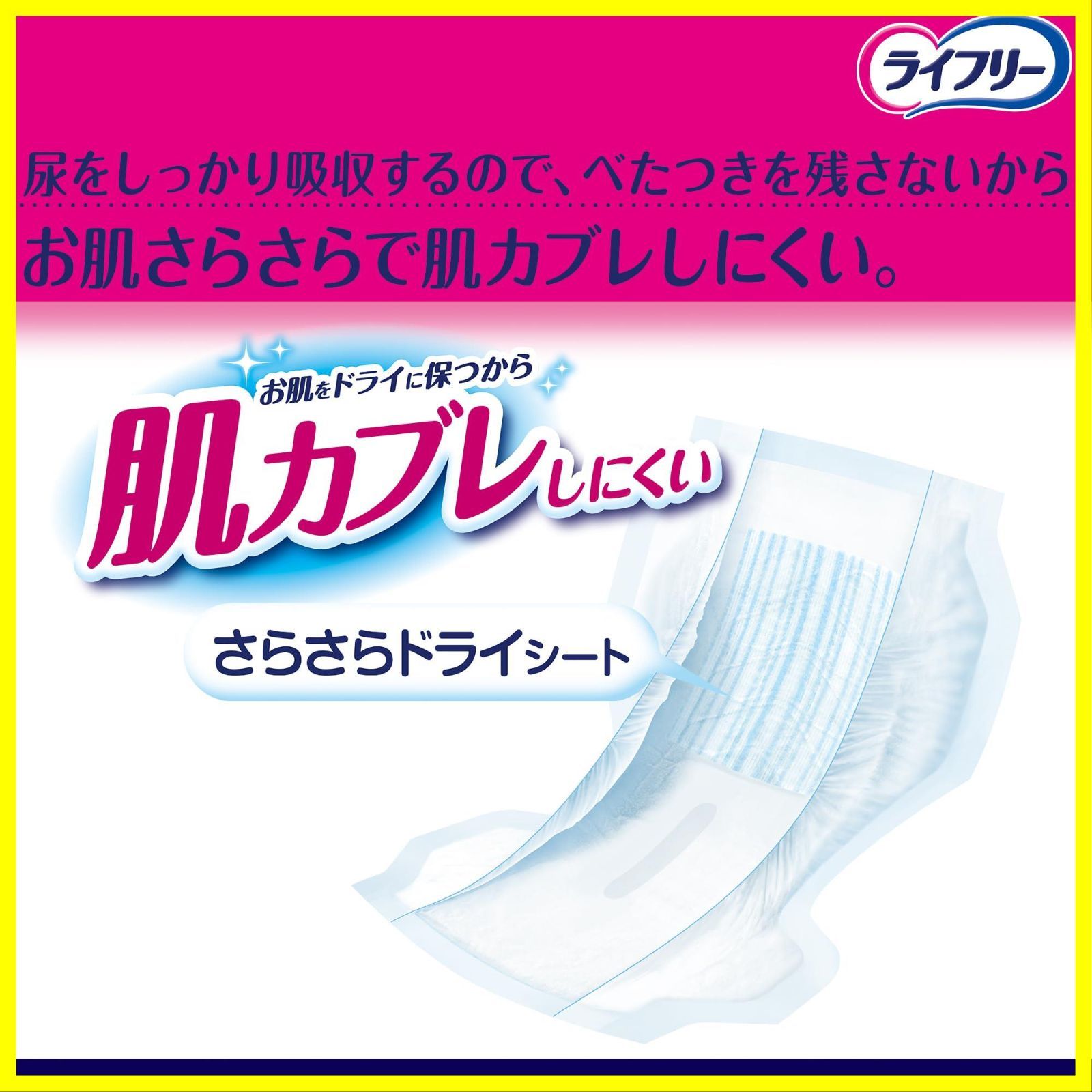●さらさらドライシートが尿をしっかり吸収するので、べたつきを残さないからお肌さらさらで肌カブレしにくい。