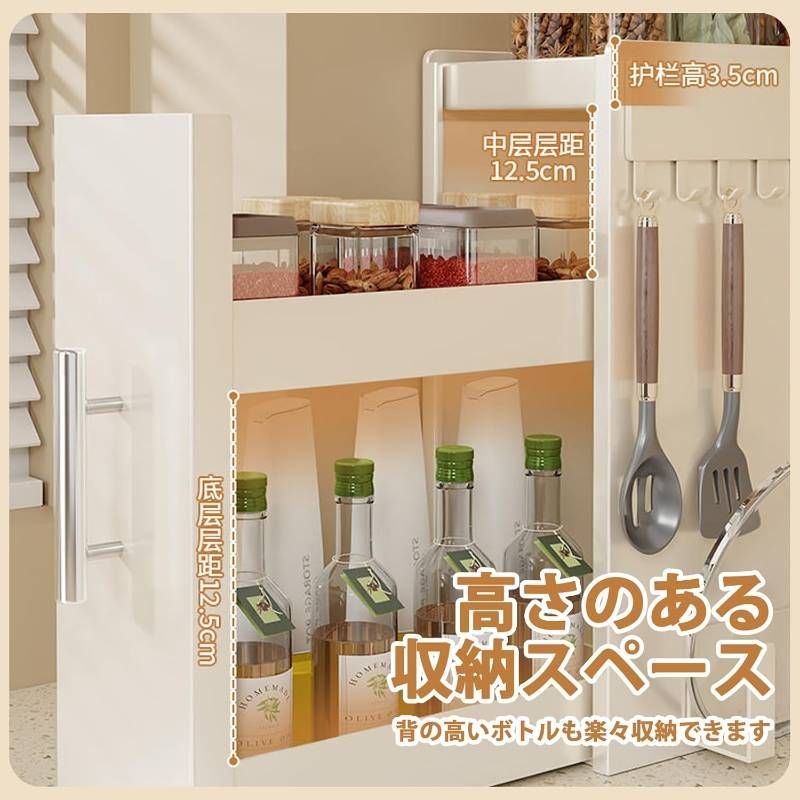 ●使い勝手の良い1段設計 細幅ながらも収納力は抜群。高さ制限の少ない1段タイプなので、醤油、みりん、料理酒、オリーブオイルなどの背が高いボトル類もまとめて収納可能です。無理に並べる必要がなく、整理整頓が簡単です。