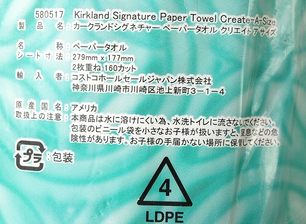・本商品は、水に溶けにくい為、水洗トイレに流さないで下さい。 ・包装のビニール袋を、小さなお子様が扱いますと、窒息などの危険性が利ます。 ・お子様の手の届かない場所に保管してください。 「主な仕様」カークランド ロールタオル(ペーパータオル) 2枚重ね 160カット 3ロール