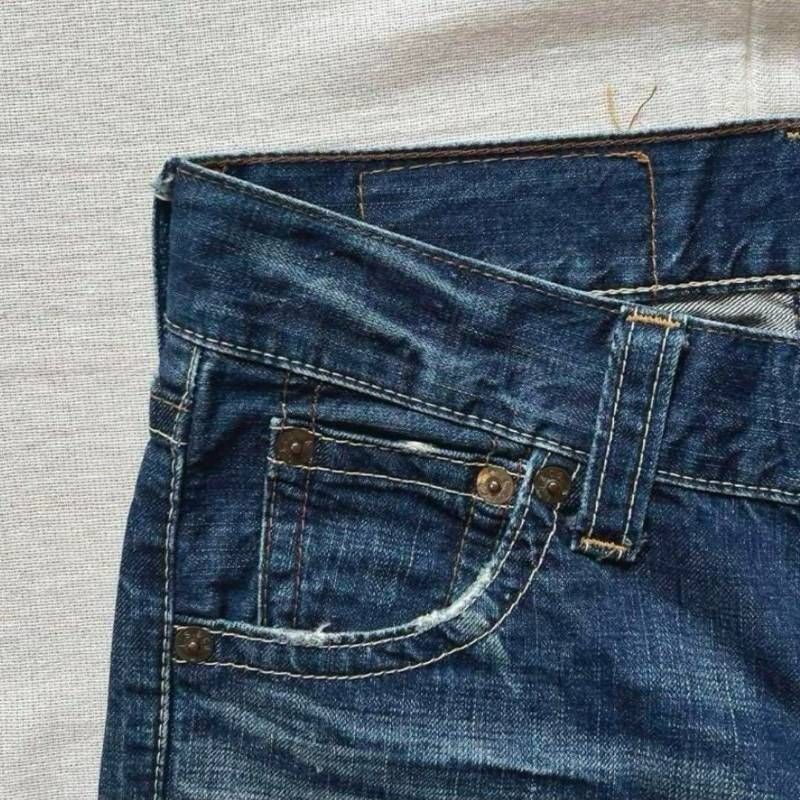 スパイダー(蜘蛛の巣)のような雰囲気も。ロゴ刻印入りウエストボタンとデカリベット、ブラウス×ベージュのステッチ、腰のビッグ紙パッチ、ポケットの軽微なダメージ加工などがポイントになったグッドデザイン。