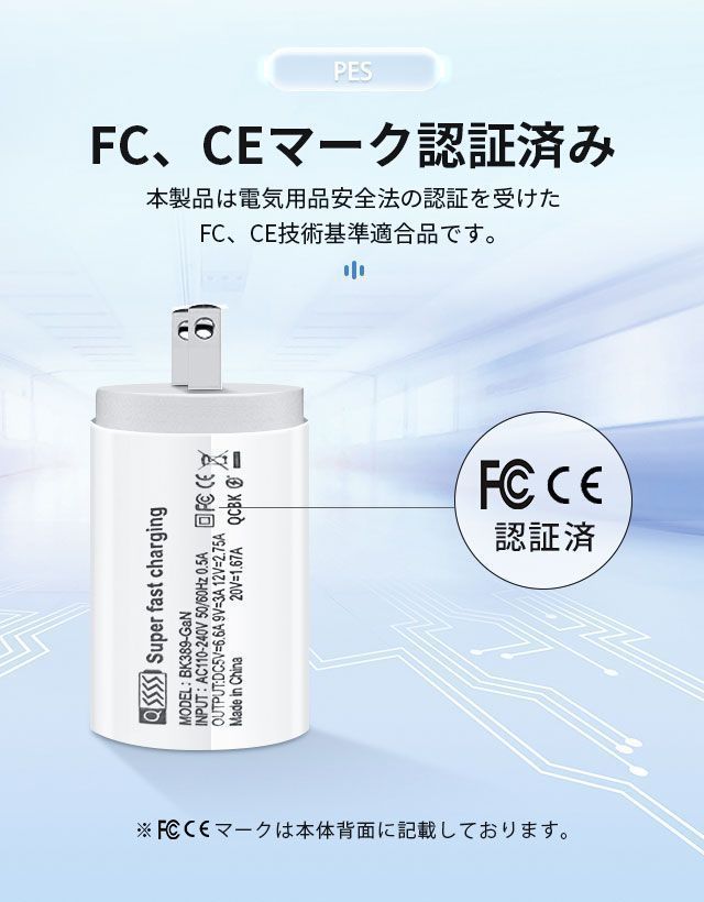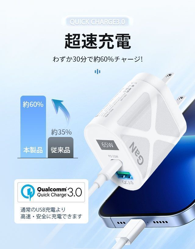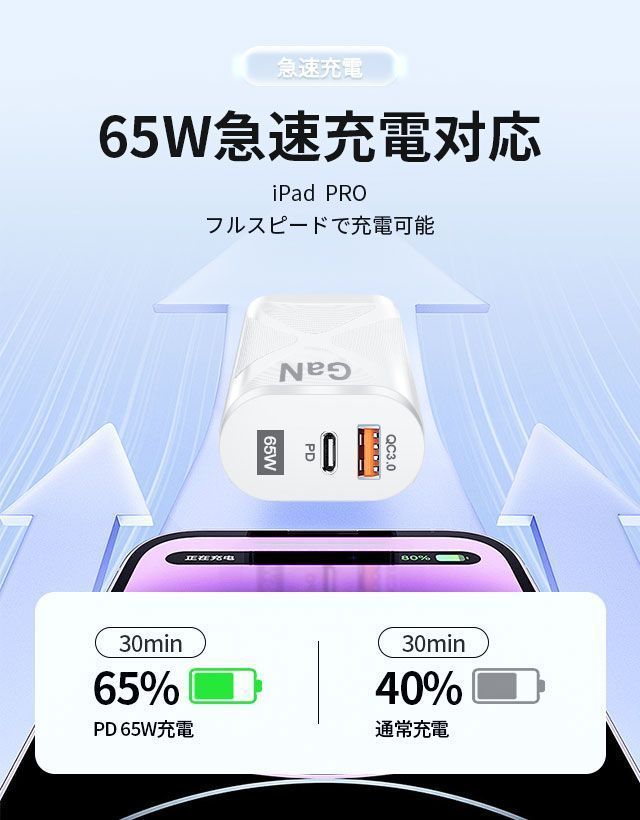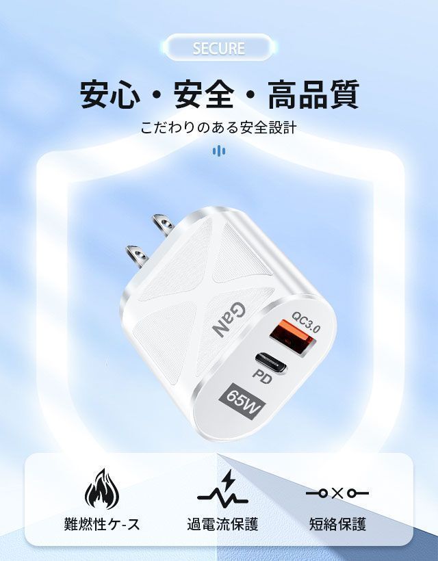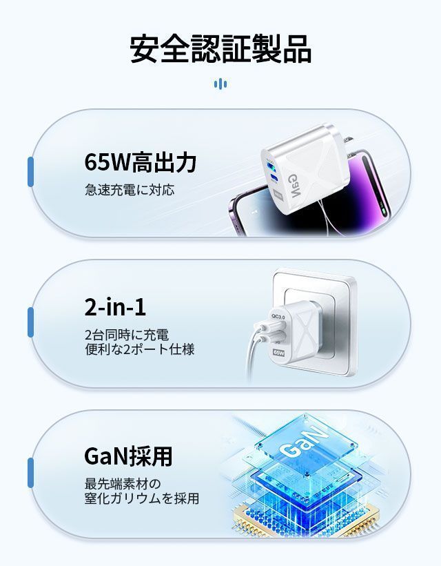 新素材GaN(窒化ガリウム)が採用され、Quick Charge3.0と合わせて65Wの高出力でスマホ、タブレット、ゲーム機だなどあらゆるType-C端子を搭載したPower Delivery関連機器をフルスピードで効率的に急速充電できます。type-C×1、USB-A×1ポートで最高2台の機器を同時に急速充電が可能です。