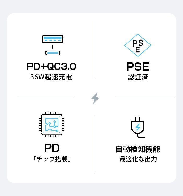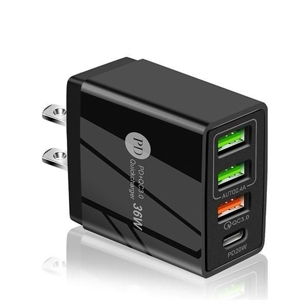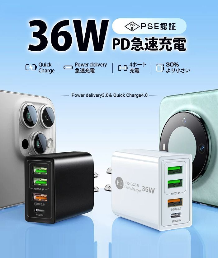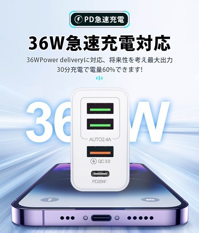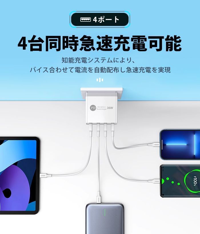 QC3.0*1ポート/2.4AUSB-A*2ポート/PD20W*1ポート搭載。コンパクトな急速充電器、最大4台同時充電まで充電速度が落ちず、快適にご使用可能。