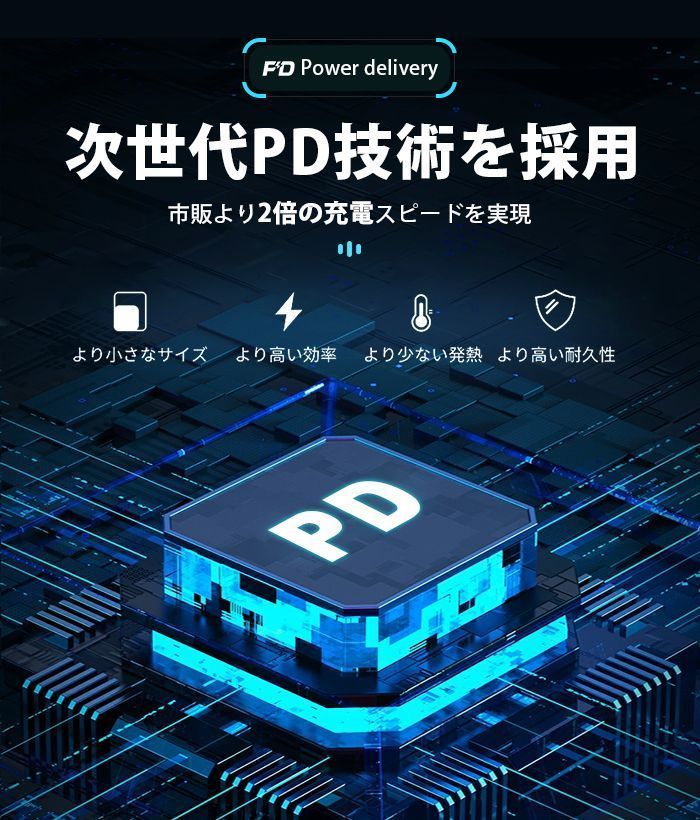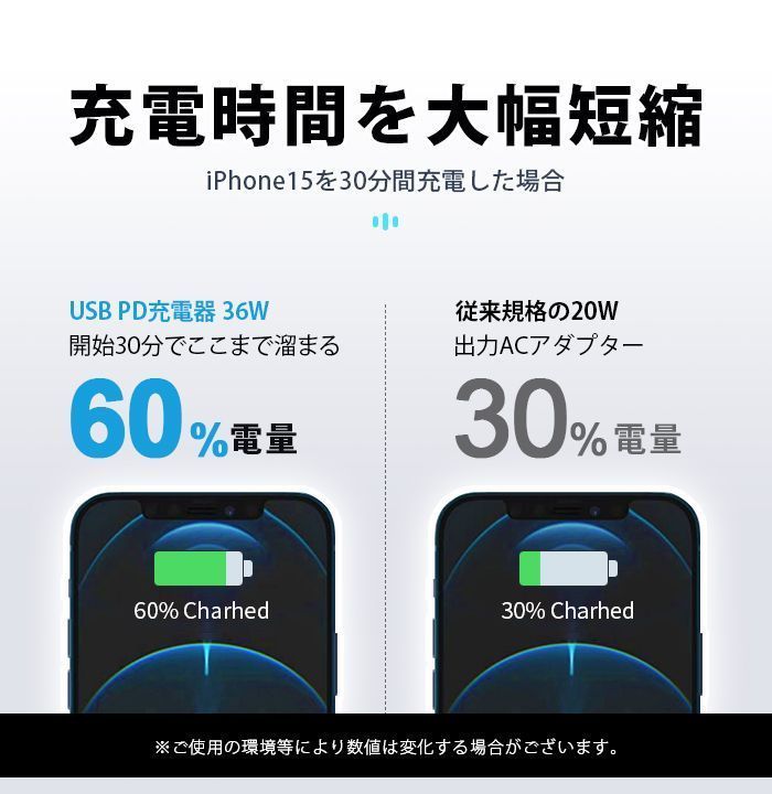 最大20W出力で、iPhone11以降機種をハイスピードで充電可能。Power Deliveryに対応し、一般的な5W出力の充電器と比べ、約3倍速く充電できます。