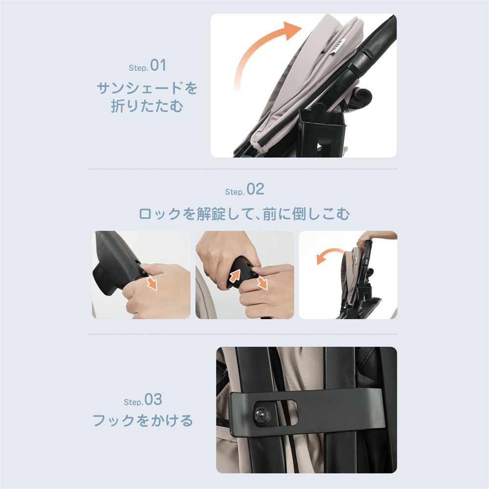 ・2.【ワンタッチ折りたたみ】バスや電車が来た時、タクシーに乗る時など、数秒でサッと折りたためるため、慌てずスムーズに移動できます①サンシェードを折りたたむ②ロックを解錠して、前に倒しこむ。③フックをかける