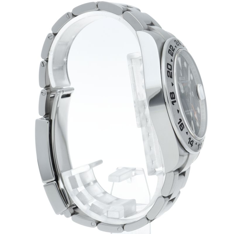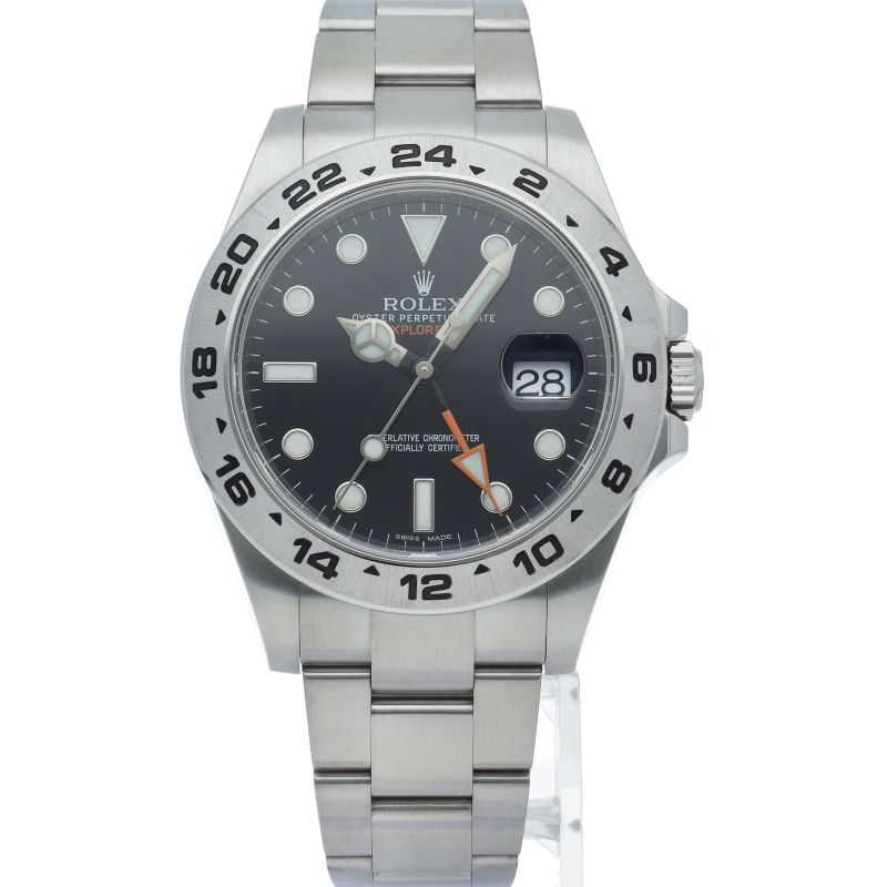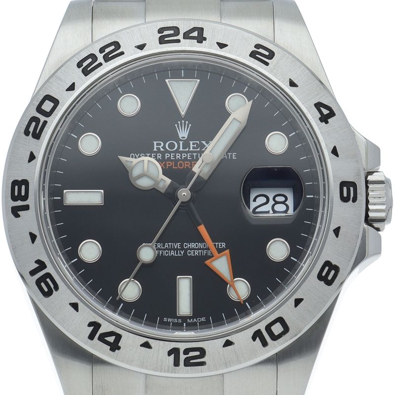 商品説明:2011年にバーゼルで発表された新型「エクスプローラー2」。ケースサイズは42ミリにアップされ初代エクスプローラー2を思わせる24時間オレンジ針が特徴的な1本。