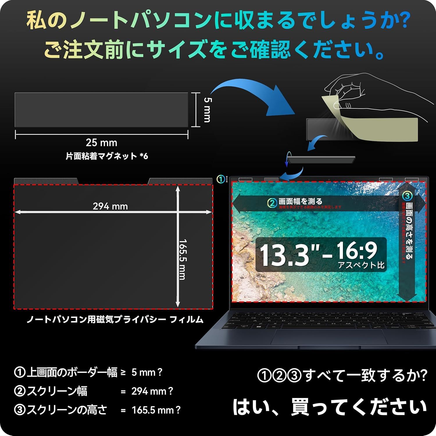 画面の表示可能画像領域が以下のパラメータを満たすノートパソコンにのみ適しています。ご注文の前に、ノートパソコン画面の表示可能画像領域の値を測定して確認してください。幅:294mm、高さ:166mm、対角線:13.3インチ(337.8mm)。HP、Lenovo、Dell、Acer、Asus、Samsung、Envy、Toshiba、その他の13.3インチ16:9アスペクト比のノートパソコンブランドと互換性があります。