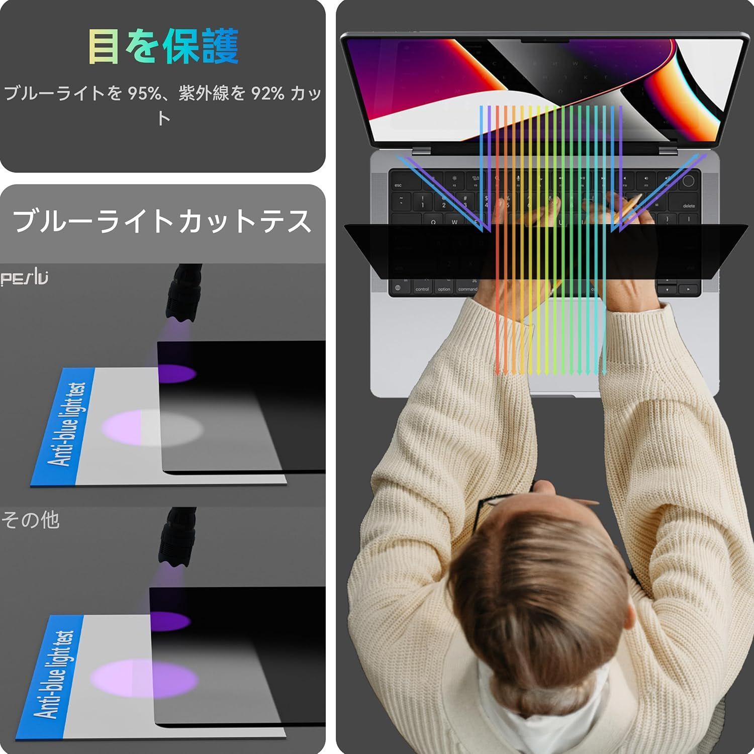 ブルーライトを95%、紫外線を92%カット。