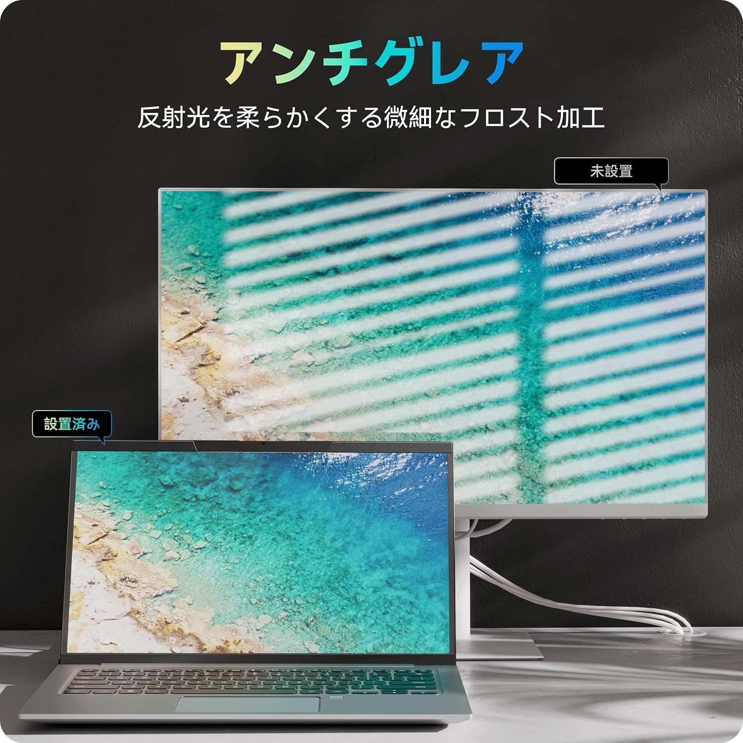 マットな表面、アンチグレアで反射光を95%効果的に遮断し日常使用による傷を防ぐ傷防止層で視力を保護しながら画面も保護します。
