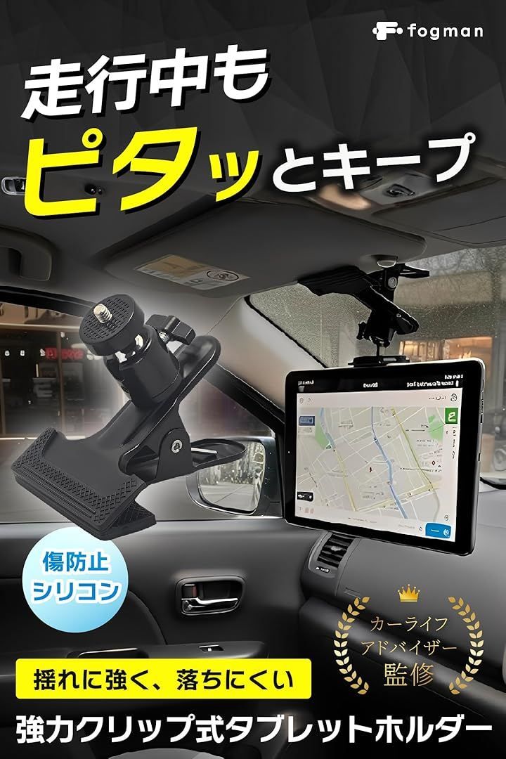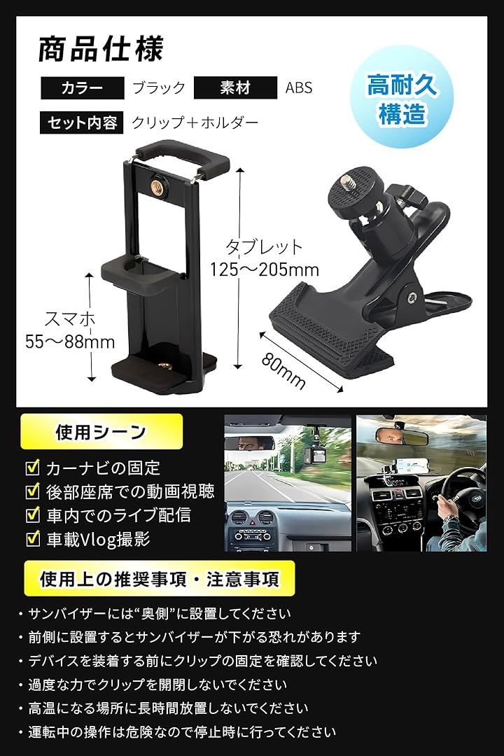「商品仕様」 素材:金属・ABS樹脂 / 対応機種:スマホ・タブレット(最大約10インチ) / 固定方式:強力スプリング式クランプ / 角度調整:360°回転ボールジョイント / サイズ:約12x8cm / カラー:ブラック