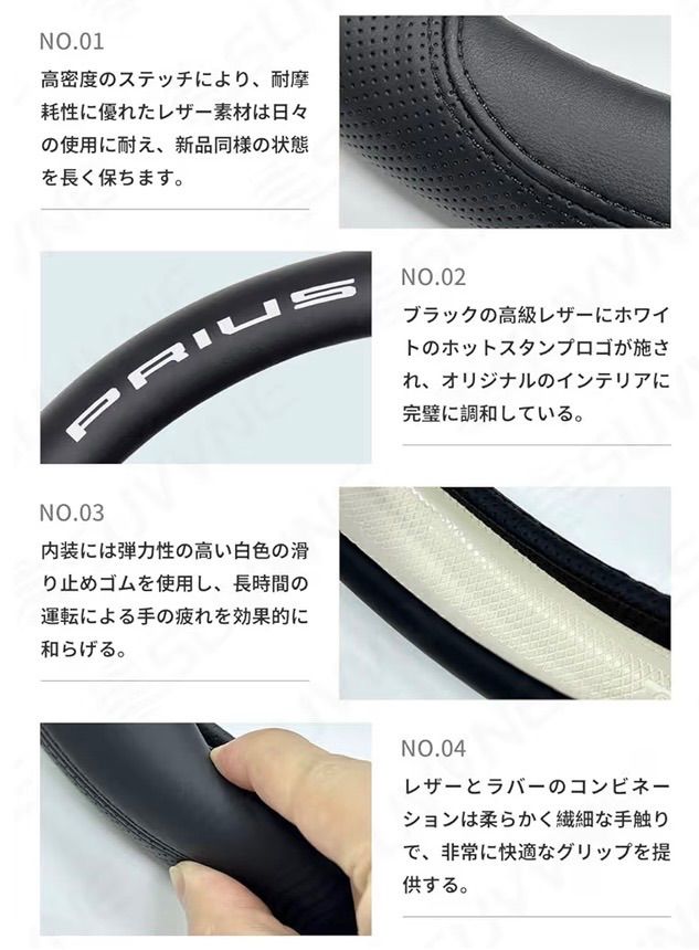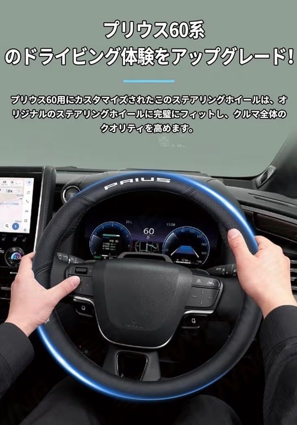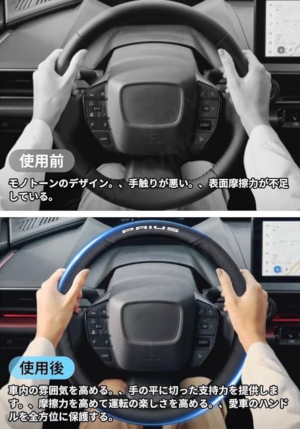 [万全な滑り止め設計] 内側の滑り止めゴムテープがハンドルに密着固定し、表面の凹凸防滑テクスチャでグリップ感を大幅向上。手とハンドルの摩擦力を高め、PRIUS 60 系の軽快な操舵特性に合わせて安定性と正確性を保障。市街地走行から高速走行まで、あらゆるシーンで安心した運転をサポートします。