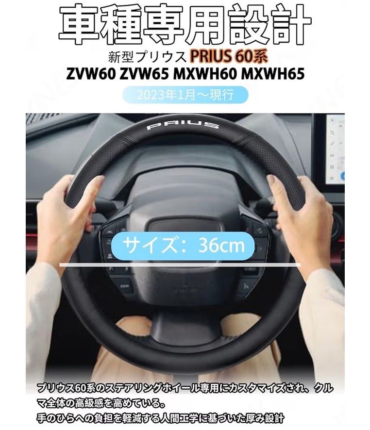 [車種専用設計] PRIUS 60 系専用ステアリングホイール保護カバーで、ZVW60 ZVW65 MXWH60 MXWH65等モデル(2023 年~現行車)に完全対応。製品サイズ:36cm。60 系ハンドルのサイズとラジアンを精密測定して開発し、ワンタッチで簡単取り付け可能。密着性に優れガタツキなし、運転操作に一切干渉しません。