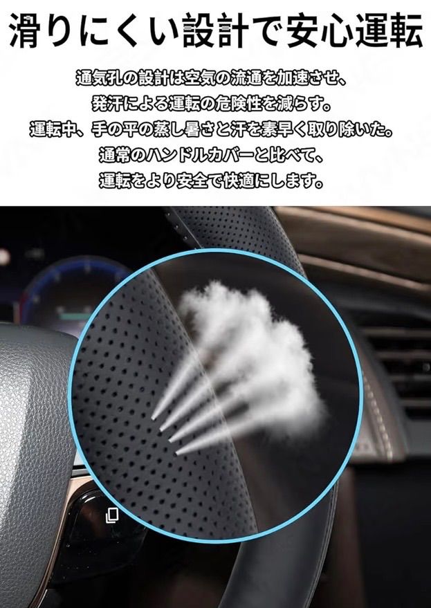 [快適な運転体験] 内層に柔らかい白色ゴムを装着し、精密な穴あけ加工による二重通気構造を採用。通気性を最大限に向上させ、手の汗や湿気を速やかに吸収。夏の蒸れやべたつきを効果的に抑制し、PRIUS 60 系の長距離走行にも対応した快適な運転環境を提供します。