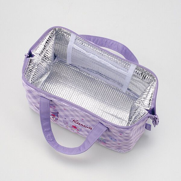 開け口とマチが広くて、中身を出し入れしやすいがま口型ランチバッグ。2段タイプのお弁当箱でも出し入れがスムーズ。内側にはアルミ蒸着素材を使用。開閉はWファスナー式。内側に保冷剤などが入るメッシュポケット付き。