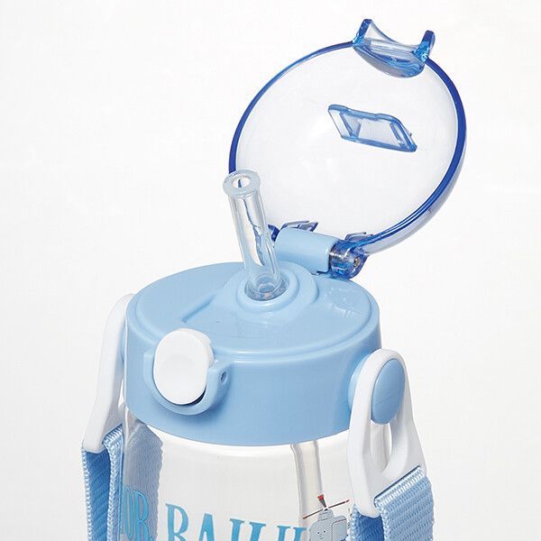 軽量でコンパクトなストロー式ボトル(水筒)。ストロー飲み用で、ストローの飲み口で飲む練習が楽しくできる。キャップはプッシュ式で簡単オープン。本体とキャップに透明度が高くて丈夫なPET(飽和ポリエチレン樹脂)を使用。飲む時にキャップが戻らないキャップロック設計。取り外し可能なショルダーベルト付き。ショルダーベルトにネームプレート付きで名前シール付き。底部に衝撃を和らげるクッション付き。食洗機は使えない。