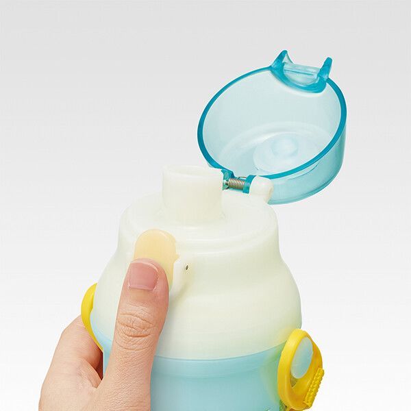 食洗機対応のプラスチック製直飲みボトル(水筒)。キャップを開けるとすぐ飲めるダイレクト飲み口。キャップはワンプッシュ式で簡単にオープン。軽くて持ちやすい形状。氷が入れやすい広口タイプ。肩に掛けて持ち運べるショルダーベルト付き。ショルダーベルトは取り外せ、長さ調節もできる。