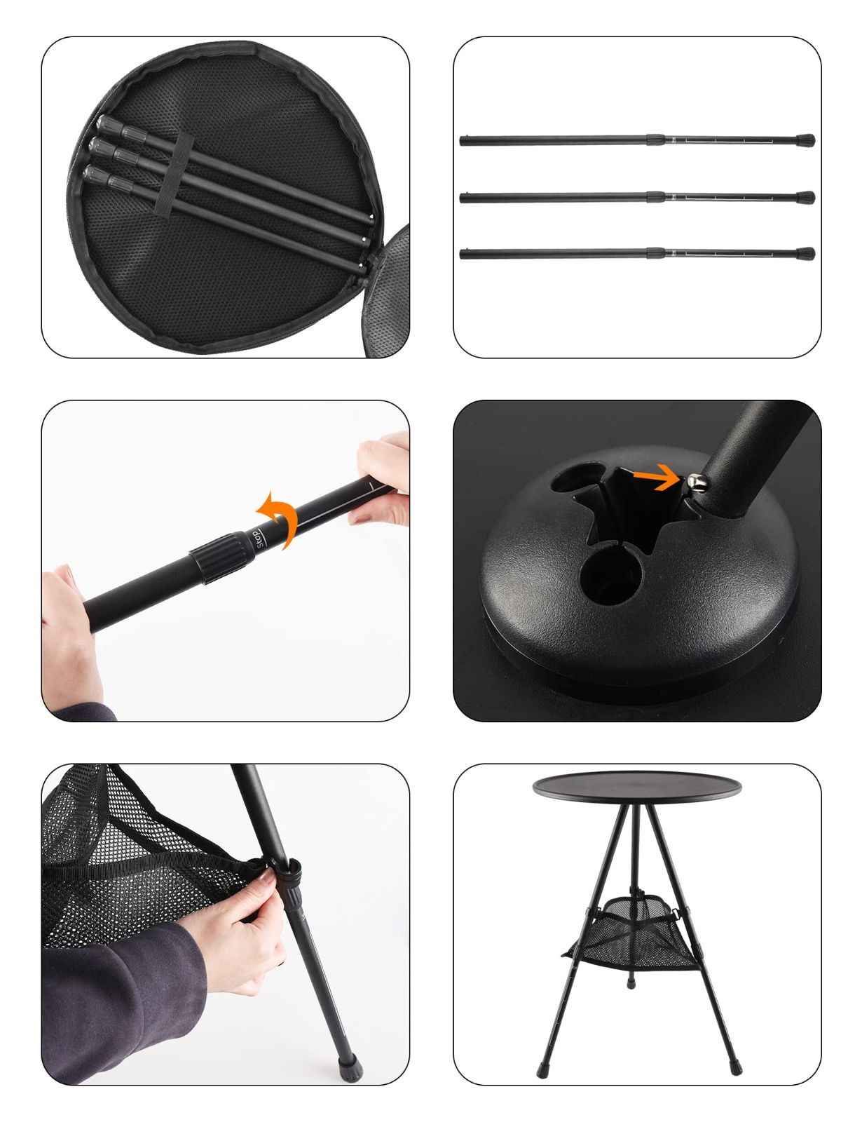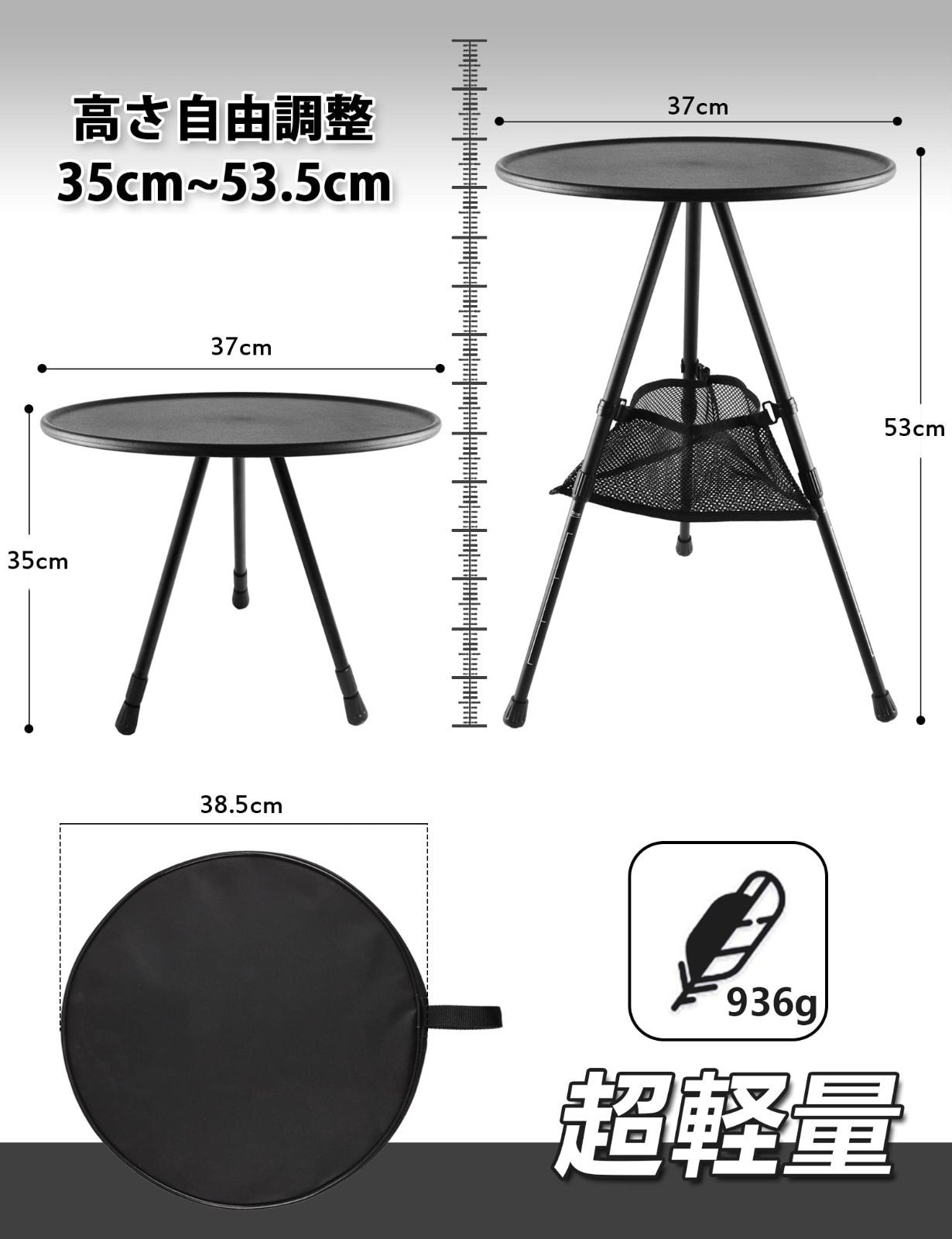 【高さ自由調整】キャンプ用テーブルの脚は自由伸縮調節可能に設計され、35cm~53.5cmの範囲でお好きな高度(5段階)を選択して回転して調整と固定ができます。キャンプ、車中泊などに食事の時は小さくてもテーブルがあると、背中を丸めなくて良いので腰を痛めにくい。コンパクトサイズなので、ソロキャンプやソロツーリングにおすすめです。