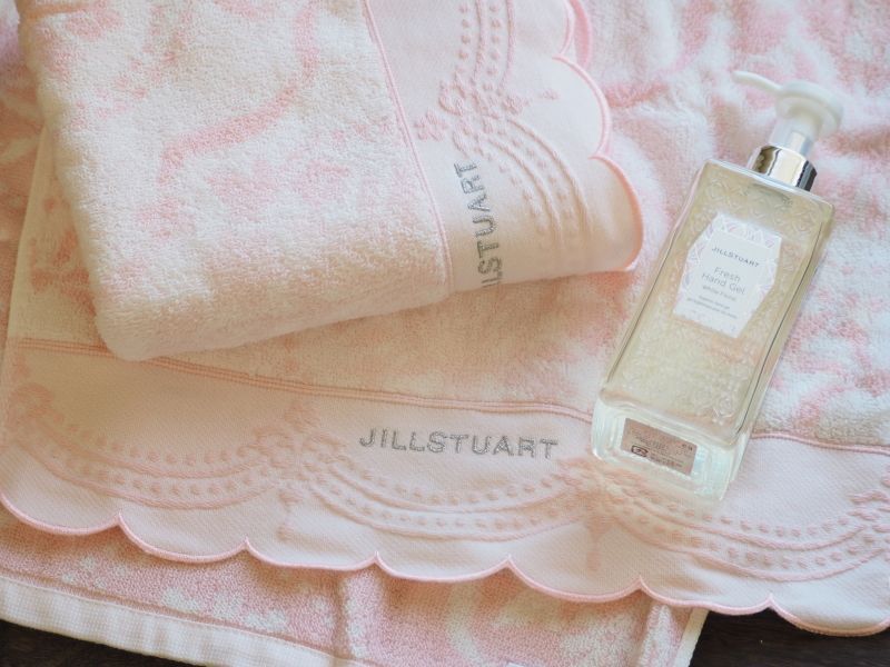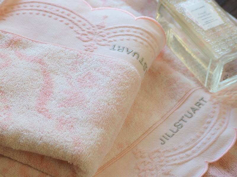 淡いピンクのタオルには「JILL STUART」のロゴ刺繍が施されており、ふわふわとした手触りと高級感のあるデザインが魅力。
