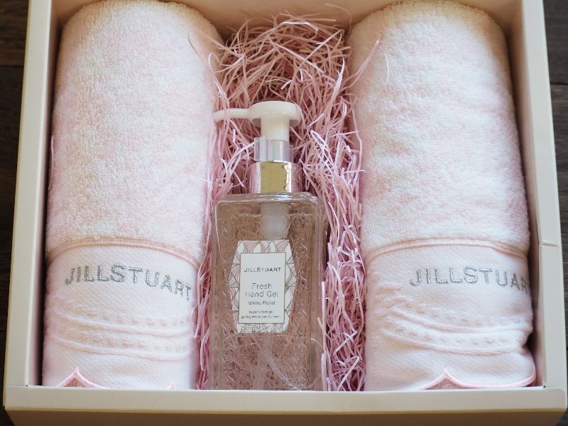 ジルスチュアートの上品で可愛らしい世界観が詰まった、フェイスタオル2枚とハンドジェルのギフトセットです。