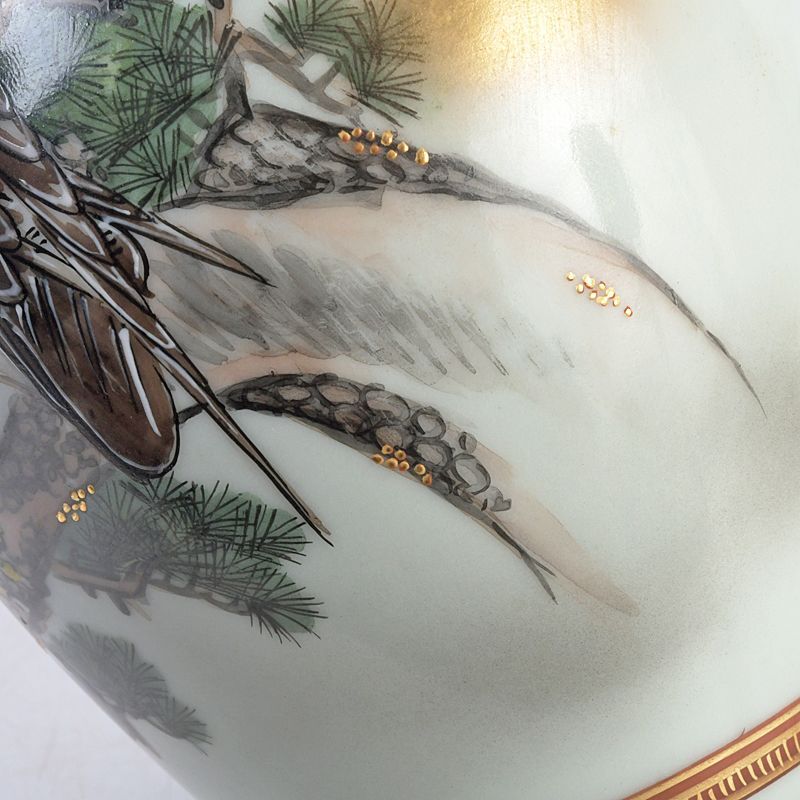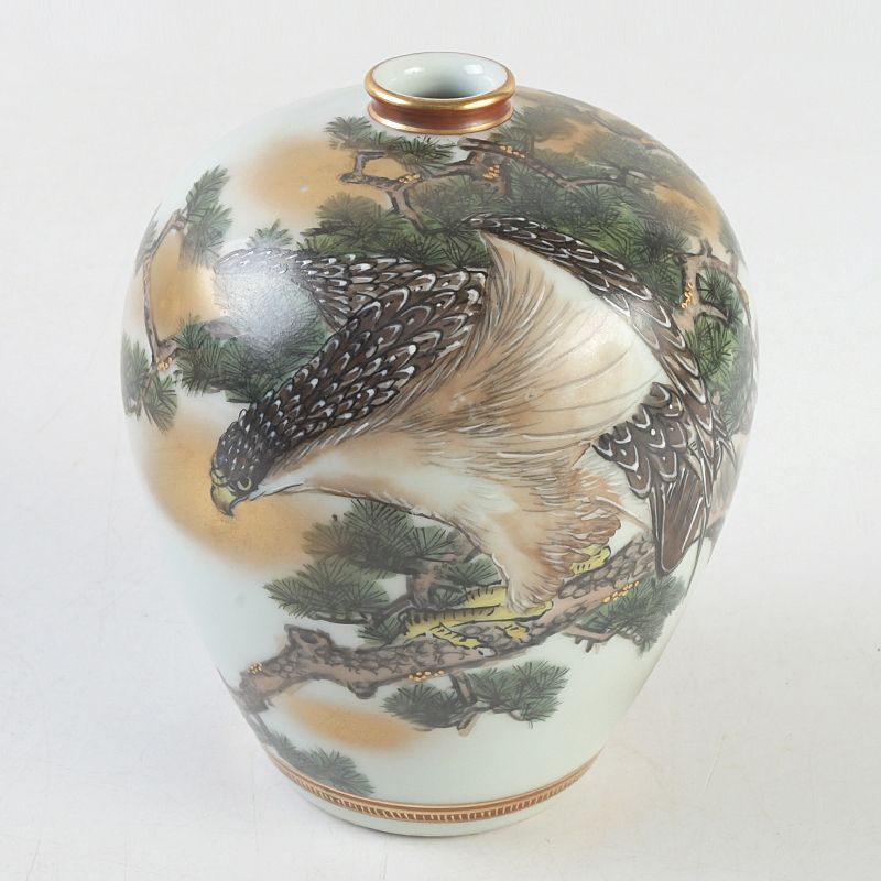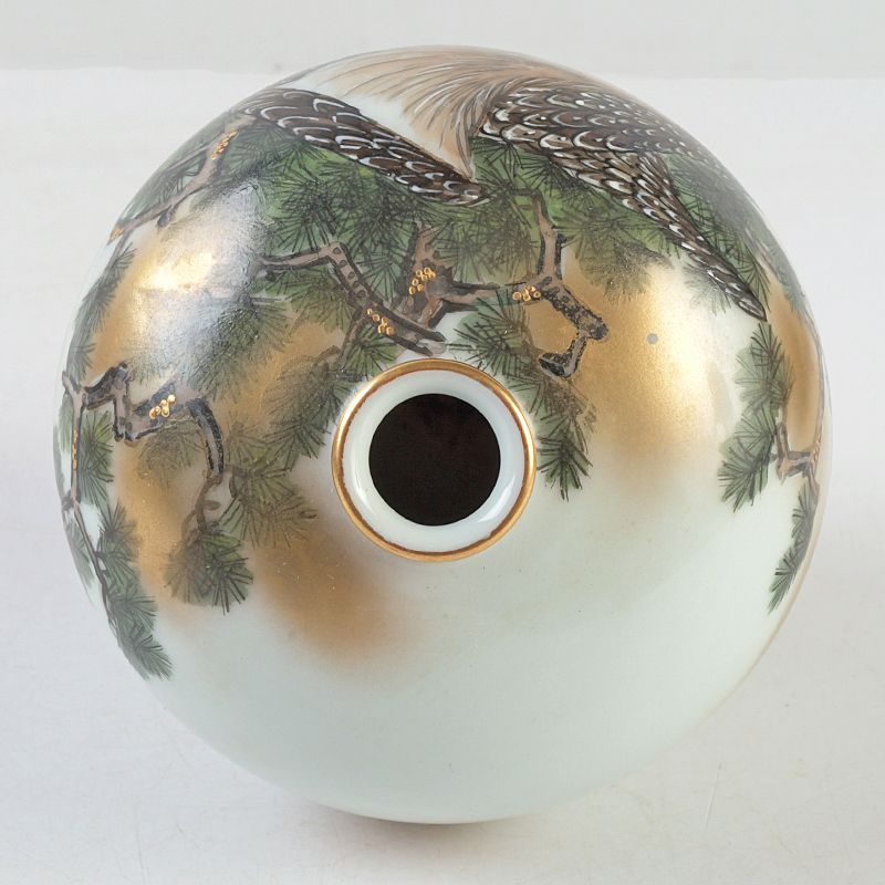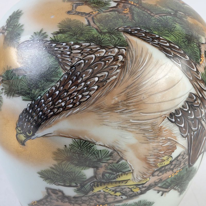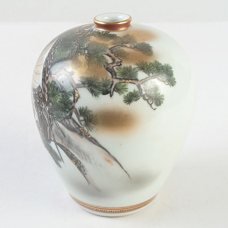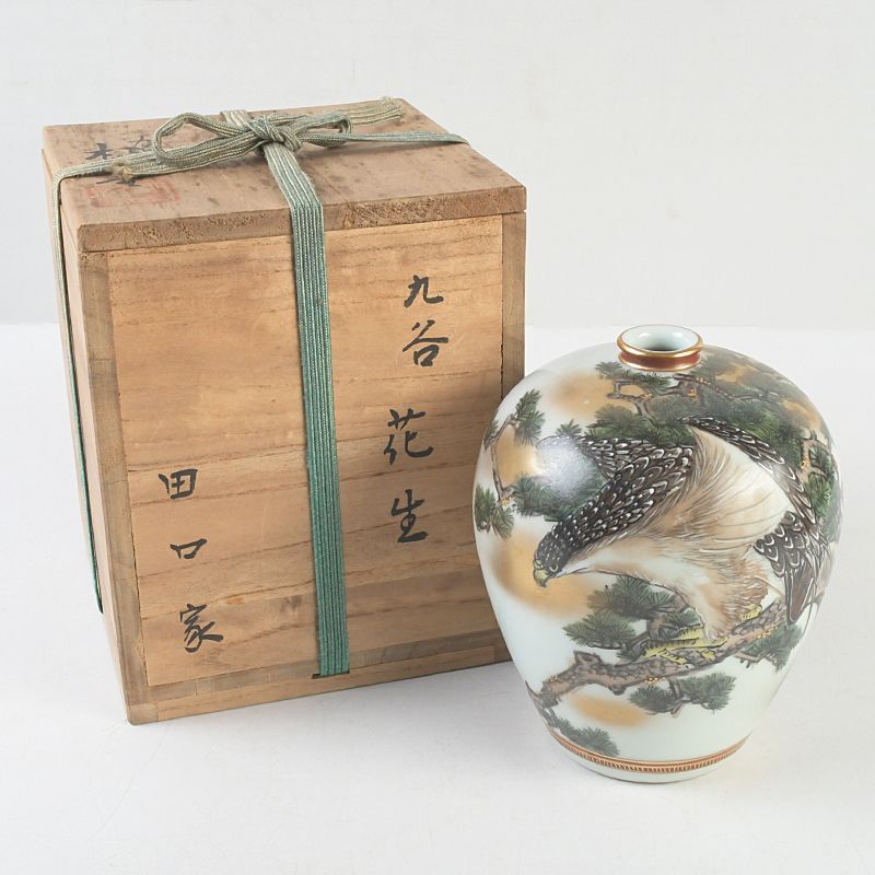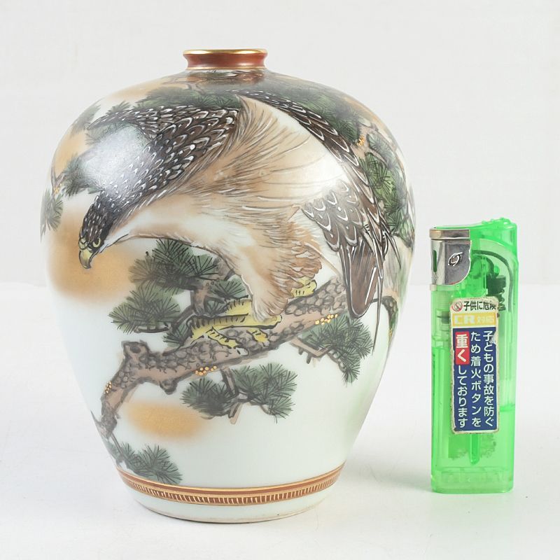 九谷焼 松寿堂 色絵金彩 松鷹文 花瓶 花生 共箱 C S493