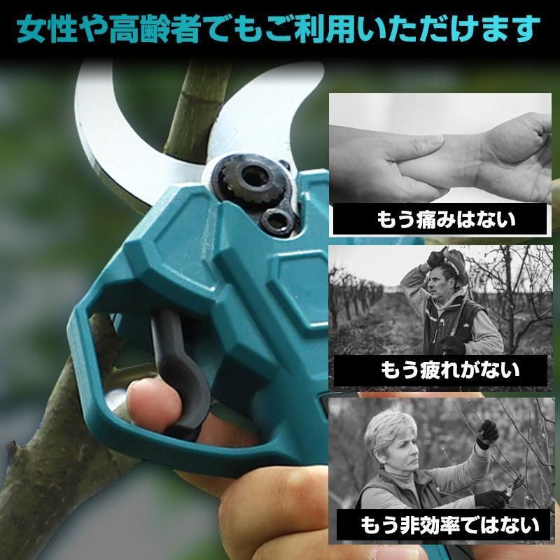 【高枝切りの延長ポールと接続可能】改善点?旧の商品に比べ、ナイフサイズ40mmになり、最大の切断経40mmに達します。強力なパワーを備えており、損傷することなく直径40mm以内の木を簡単に切断できます。電動剪定ばさみは、従来の手動剪定よりも10倍効率的に機能します。