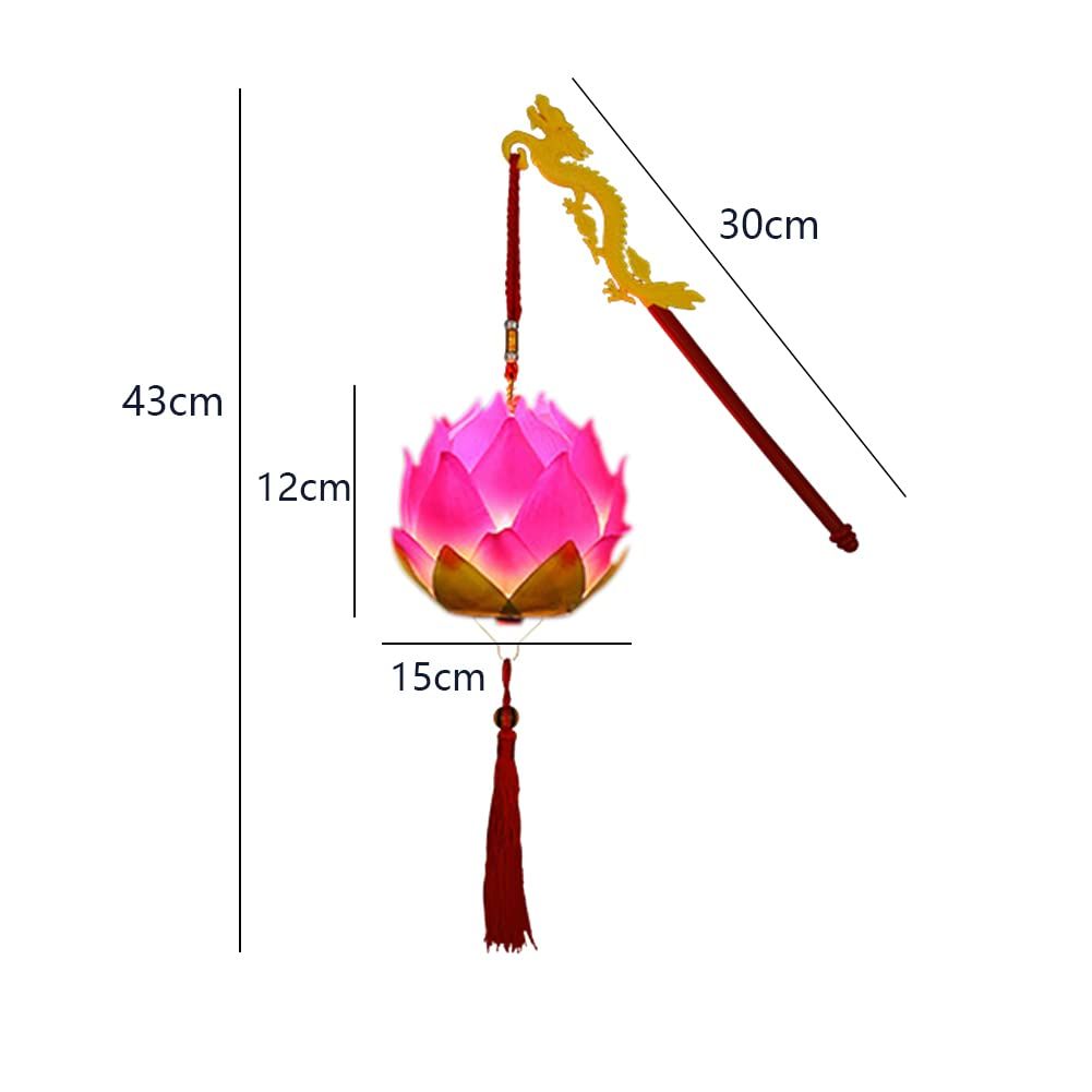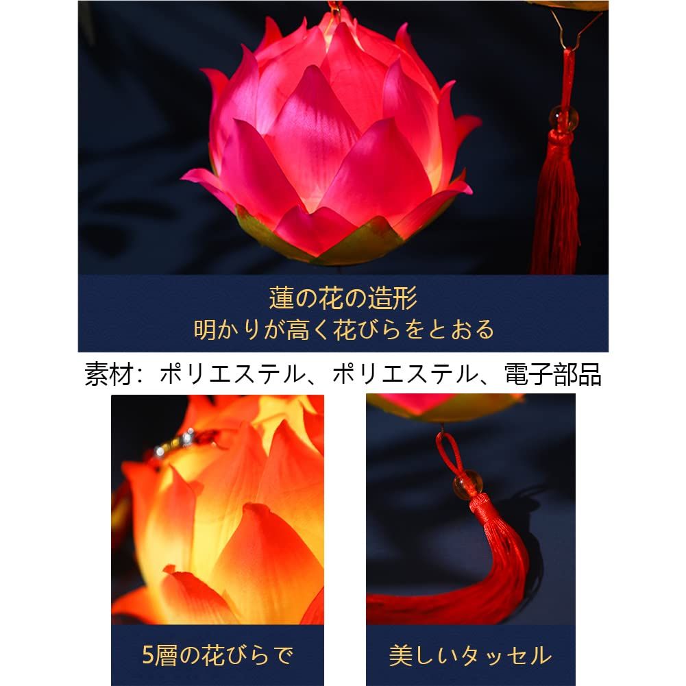 ?製品名:電池式LED・蓮提灯。?素材:ポリエステル、ポリエステル、電子部品。?サイズ:ランタン高さ12cm、幅15cm、全長43cm。ハンドル約30cm。?カラー:ローズレッド。?パッケージは以下を含みます:ハンドル+蓮ランプ+バッテリーケース+ボトムカバー+ストラップ+クリスタルビーズ+フック+タッセル。(単4電池無し、別売り)
