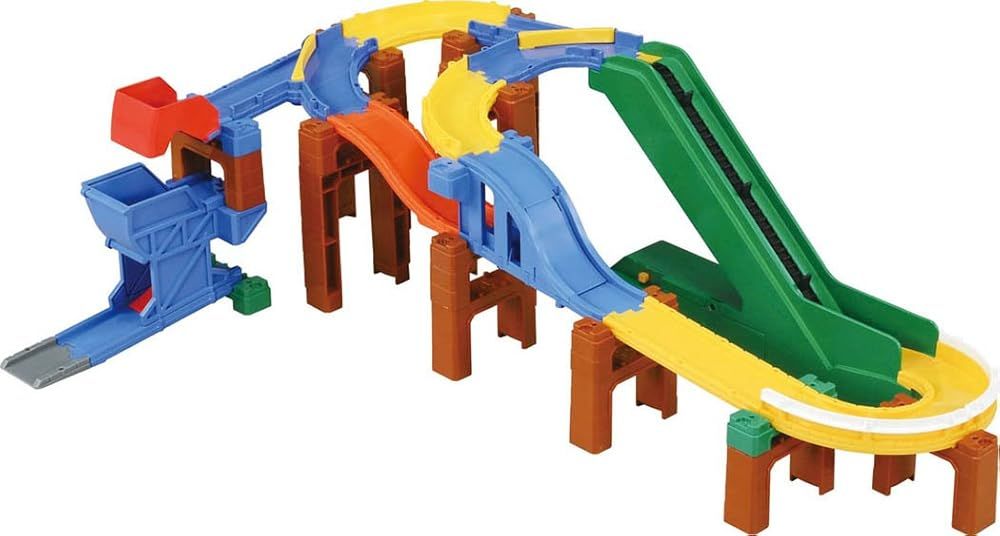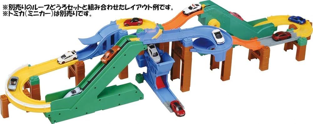 【セット内容】坂直どうろ(1),坂曲どうろL(4),3段スロープ(1),分岐どうろL(2),立体合流どうろ(1),ダイブどうろ・本体(1),ダイブどうろ・ガードフェンス(1),ダイブどうろ・ガードフェンス取付用橋脚(1),電動スロープM(1),8段橋脚(4),4段橋脚(6),3段橋脚(3),2段橋脚(2),1段橋脚(2),ガードレール(2),取扱説明書(1),※トミカ( ミニカー)は別売りです。