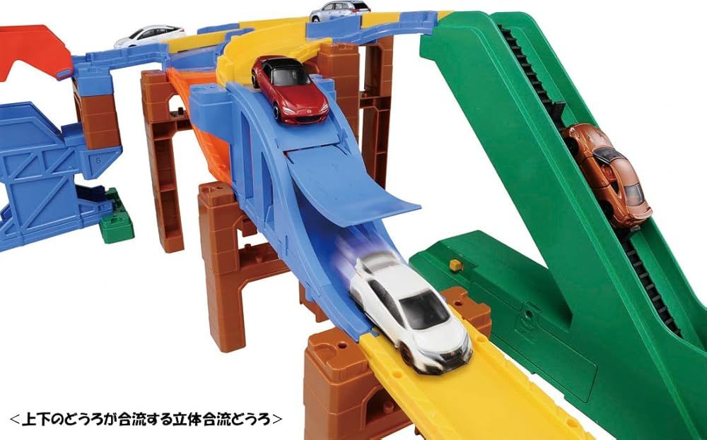 トミカの走行コースが、立体合流どうろで1つに結ばれる2つの自動循環コースと、コース外にトミカが飛び降りるダイブどうろに至るコースの3通りあります。