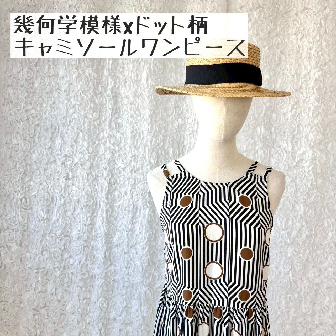 モノトーンの幾何学ストライプに、丸ドットを重ねた印象的なデザイン。