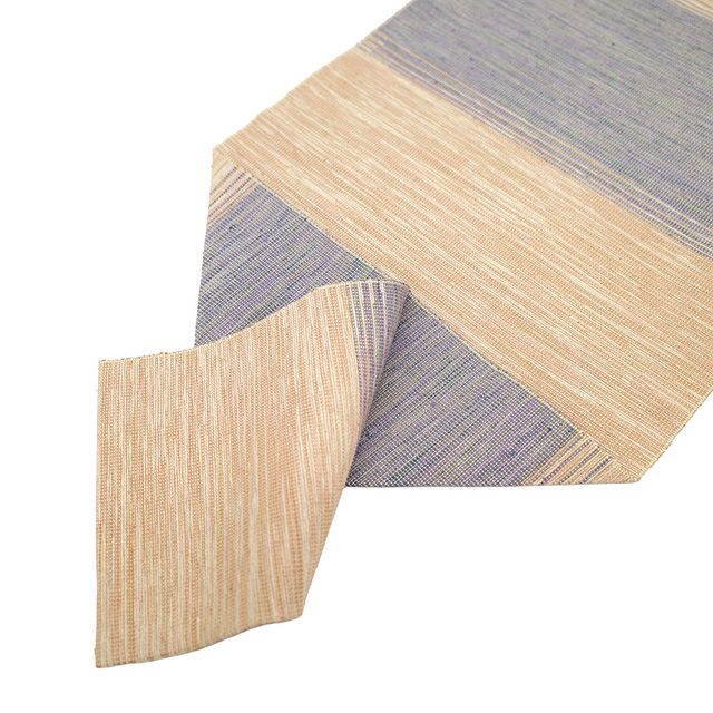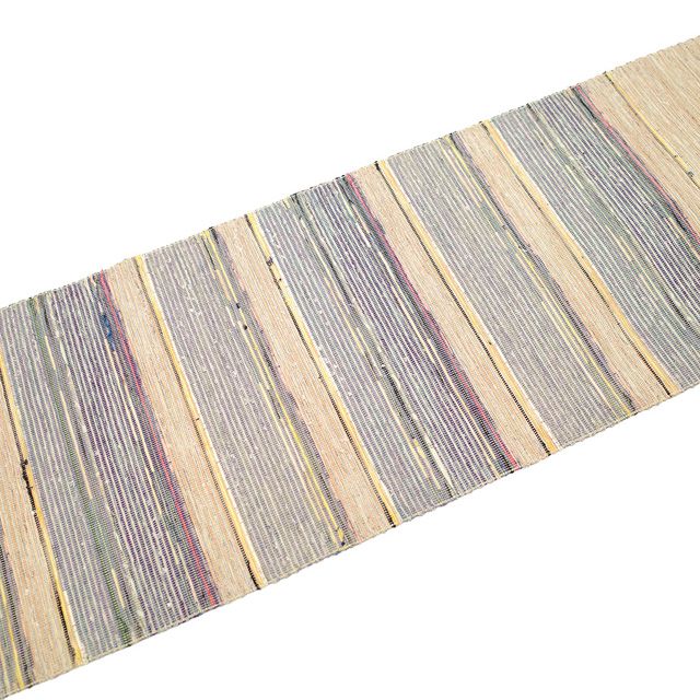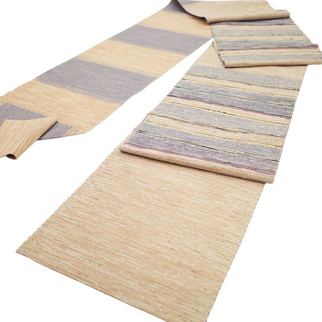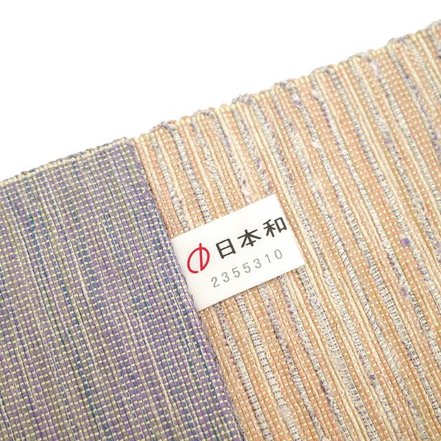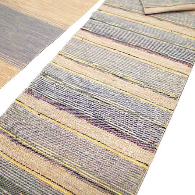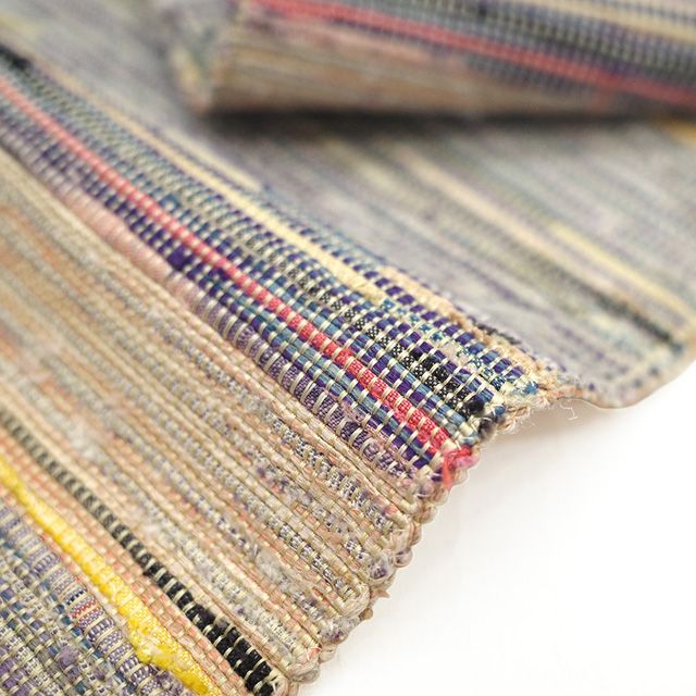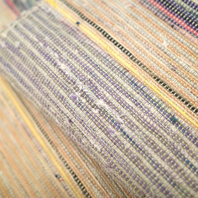 こちらのお品は、オレンジベージュ・薄紫・黄色・黒 など多彩なお色で、横縞が裂き織にて織り上げられています。