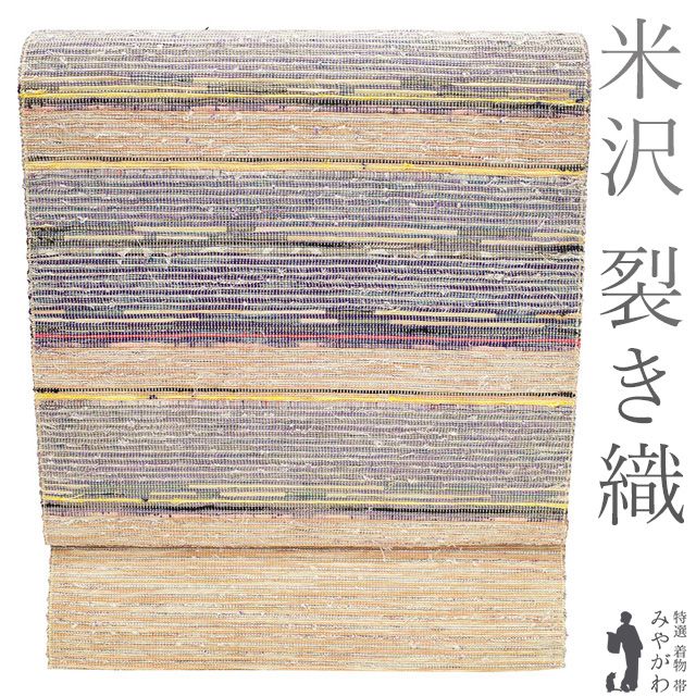 【新古品】 名古屋帯 未使用 米沢 米澤 裂き織 裂織 八寸 正絹 オレンジベージュ 薄紫 黄色 黒 横縞 カジュアル 日本和装扱い 春 秋 冬 上質 なごや帯 八寸名古屋帯 裂き織り 美品 仕立て上がり みやがわ sb54912