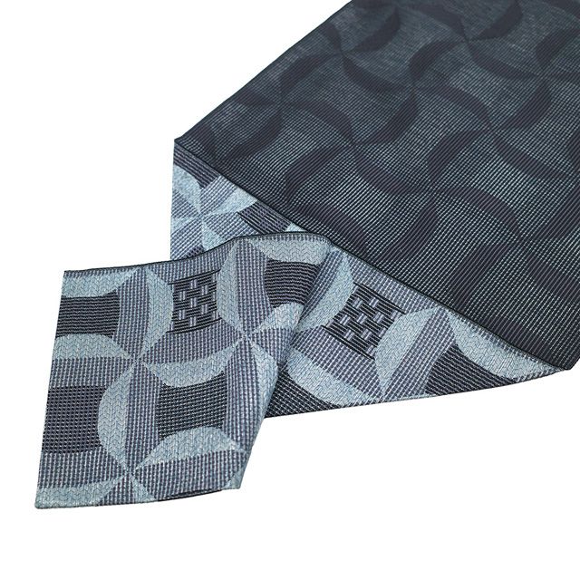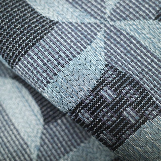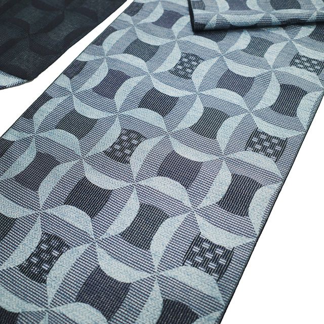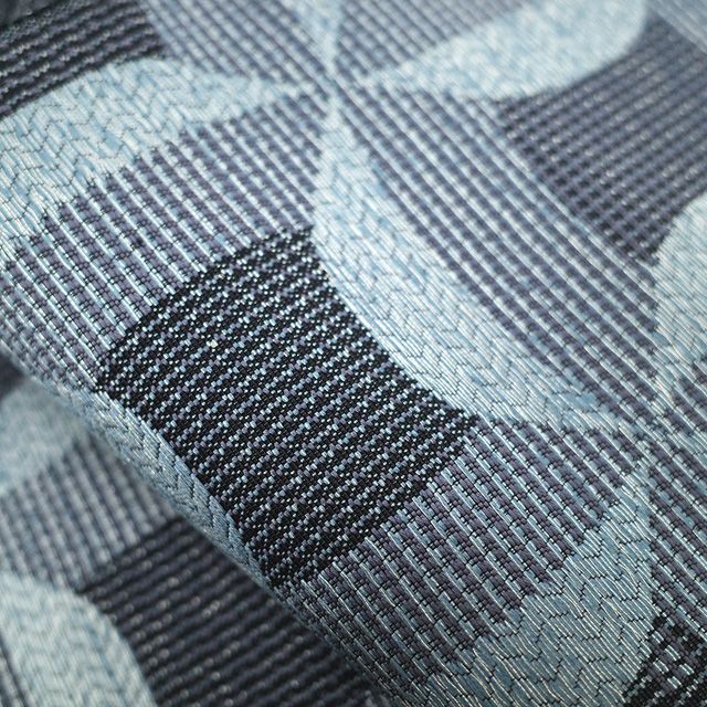こちらのお品は、水色・紫・黒で風車をイメージしたようなモダン柄が丁寧に織り上げられています。