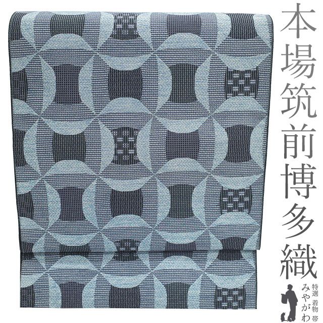 【新古品】 名古屋帯 未使用 本場筑前博多織 正絹 八寸 博多織 博多帯 銀糸 水色 紫 黒 モダン柄 おしゃれ 三松扱い カジュアル 美品 春 秋 冬 なごや帯 八寸名古屋帯 仕立て上がり みやがわ sb54915