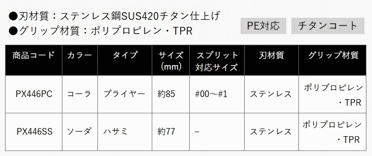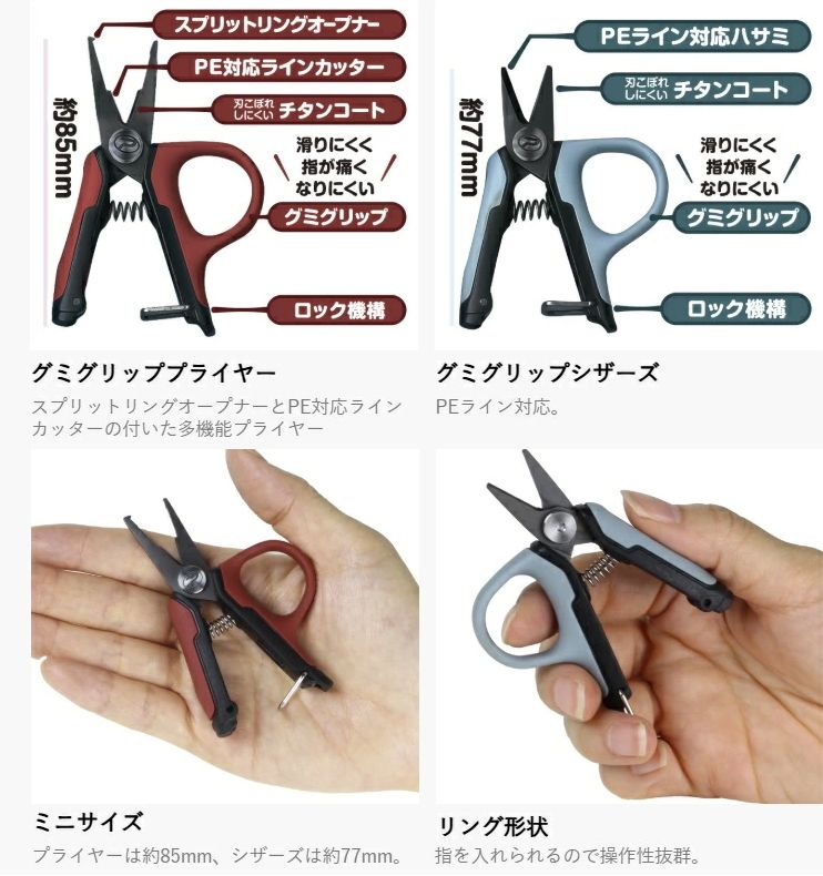 コンパクトで携行性に優れながらも握りやすい形状で操作性も抜群。グリップのリング部分は、タイプは、グミのような弾力があり、しっかり握れて手指が痛くなりにくい。グミグリップシザーズはソーダカラーのグリップを採用。全長約77mm。PEライン対応。刃部分はステンレス鋼SUS420にチタンコート、安全なロック機構を搭載。小さくでも実用性にも優れたフィッシングツール。
